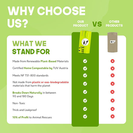 - 100% HOME COMPOSTABLE DOG POOP BAGS - Our unscented poop bags for dogs are ethically sourced and carefully manufactured from 100% botanical plant components. We use only Cornstarch, BPAT (compostable polymer), and edible glycerin in the nature-based creation of our doggie poop bags. All our products are TÜV AUSTRIA Home Compost Certified to be of ASTM D6400, EN 13432 and NF T51-800 standards!