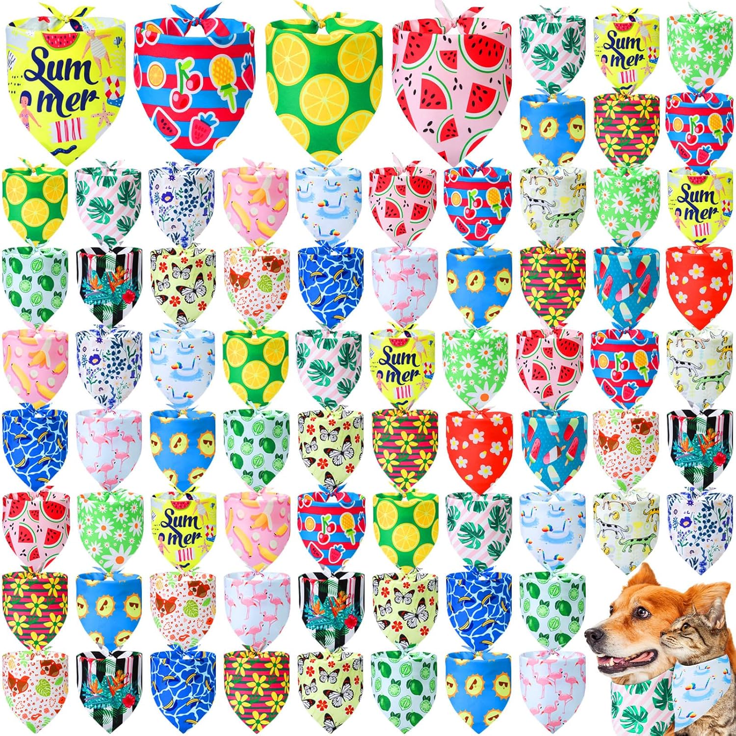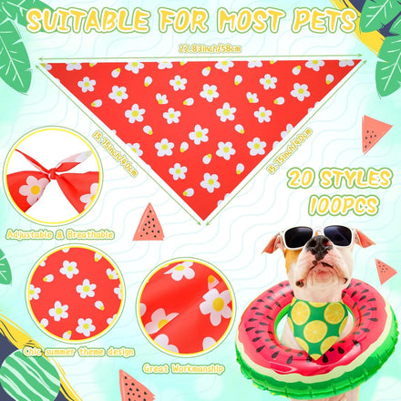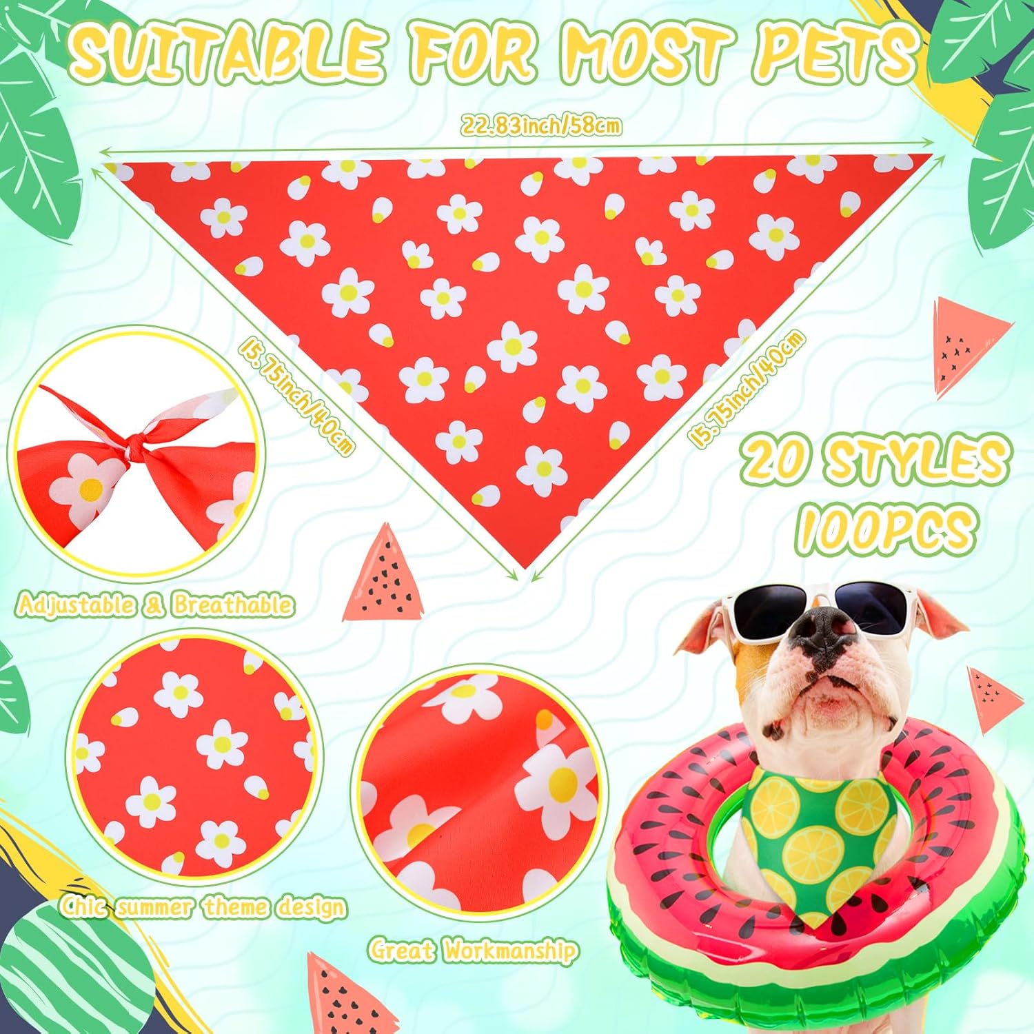 - Package Includes: you will receive 100 pieces of bulk summer themed bandanas for dog, printed with 20 different patterns, including flowers, watermelon, lemon, summer, animal, etc.; Sufficient quantity, rich styles, full of passion and relaxation atmosphere; Only suitable for pets with a neck size of about 23 inches or less