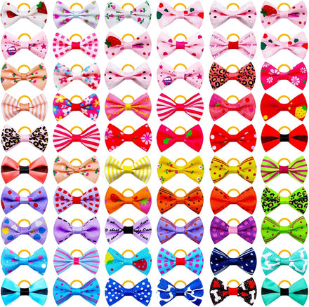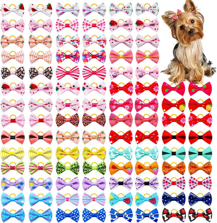 Super Value 100PCS - The cute girl dog bows set contains 100 pieces/ 50 pairs puppy bowknot in various patterns. The dog grooming bows is perfect to attach to pet hair for a fancy hairstyle. Dog Bows Size - The size of the pet grooming bows is about 1.42 inches, which is suitable for small and medium pets. The size of the puppy rubber band is specially designed for pet , suitable for long-haired or short-haired pets. Strong & Durable - The dog hair accessories for small dogs are made of high quality grosgrain ribbons and rubber bands. The handmade bow is sewn on the back of the rubber band and glued together with hot glue for double fixation. All bows keep good shape, lovely and beautiful. Very cute hair bows, make your pet (dog, cat ,rabbit)looks more lovely and attractive,can DIY dog bow tie. They also can fit for baby girls cat ,rabbit,perfect for any Accessories. perfect grooming bows for your lovely pet. Excellent Pet Hair accessories - The dog hair bows is in good shape and cute, very suitable for daily wear and various holiday parties, such as pet birthday party, Christmas party, pet beauty salon, etc. It is very suitable for yorkie, shitzu and other puppy dogs.