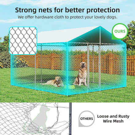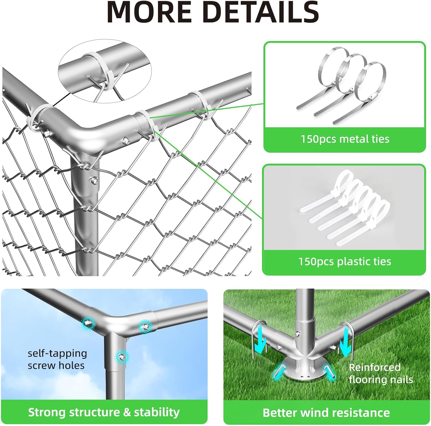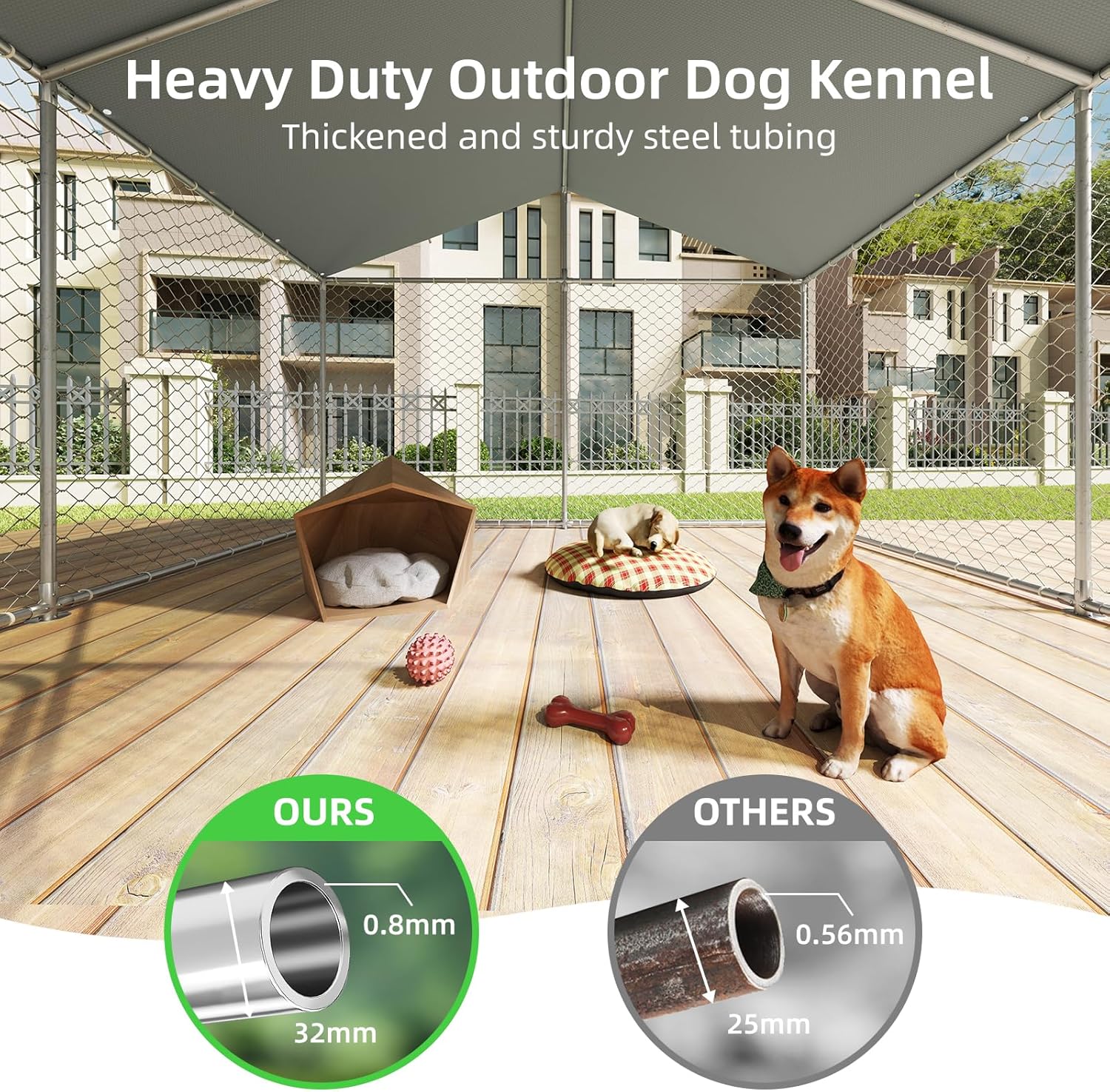 Upgraded Structure and Stronger Material: The upgraded outdoor dog kennel is made of 1.25 inch thick galvanized metal tubing to ensure high strength and durability; the overall structure stays stable and resistant to damage. but it also comes with raised legs that can be inserted into the ground to ensure that the kennel is not easy to move