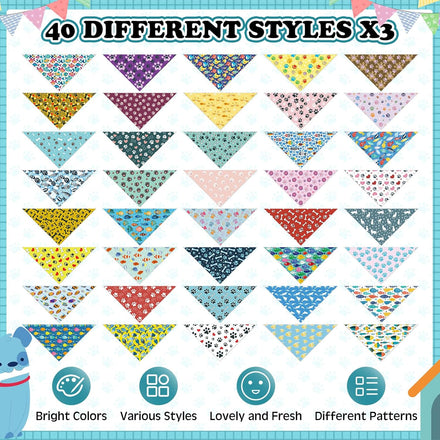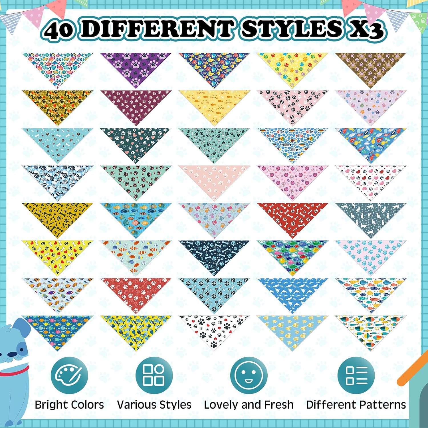 - Enough Styles to Change: you will receive a package of 120 pcs individual dog bandanas, sufficient to fit any need; These dog bandanas contain 40 different patterns, with each pattern coming in a set of 3; There is plenty of flexibility to swap and replace bandanas, ensuring your pet dog will always appear stylish; These plentiful bandanas also serve as fashionable gifts for your pet