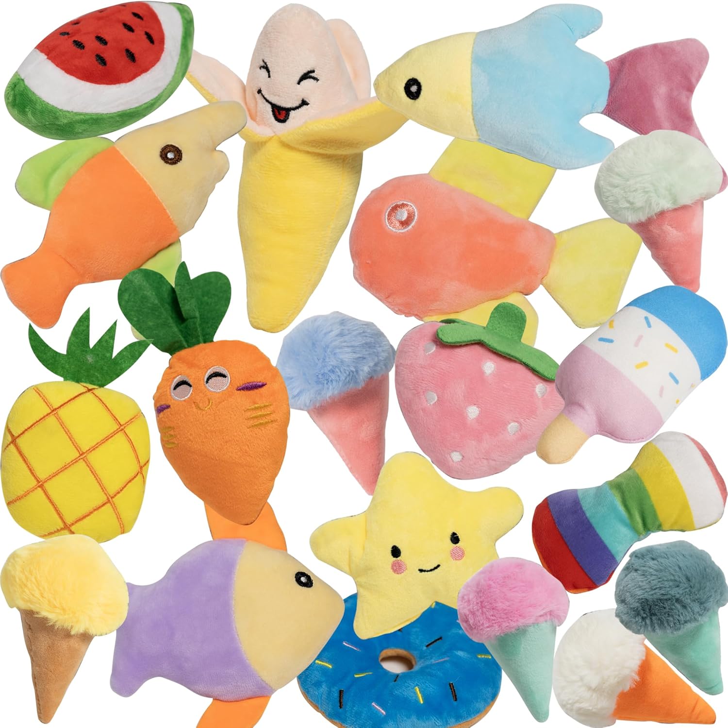 • 【Diverse Designs】19 pack small dog toys with soft stuffed squeaky toys come in a variety of shapes and designs,such as fish, bananas, strawberries, bones, donuts, pineapples, carrots, watermelons, ice cream, etc,(Tip: 6pcs cute ice cream puppy toys, only ringing paper, not squeaker)