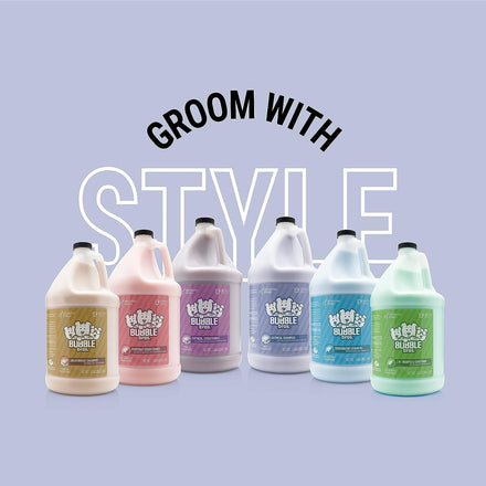 Bubble Bros, a Groomer's Choice brand, includes a variety of pet supply items such as shampoos, conditioners, and colognes.