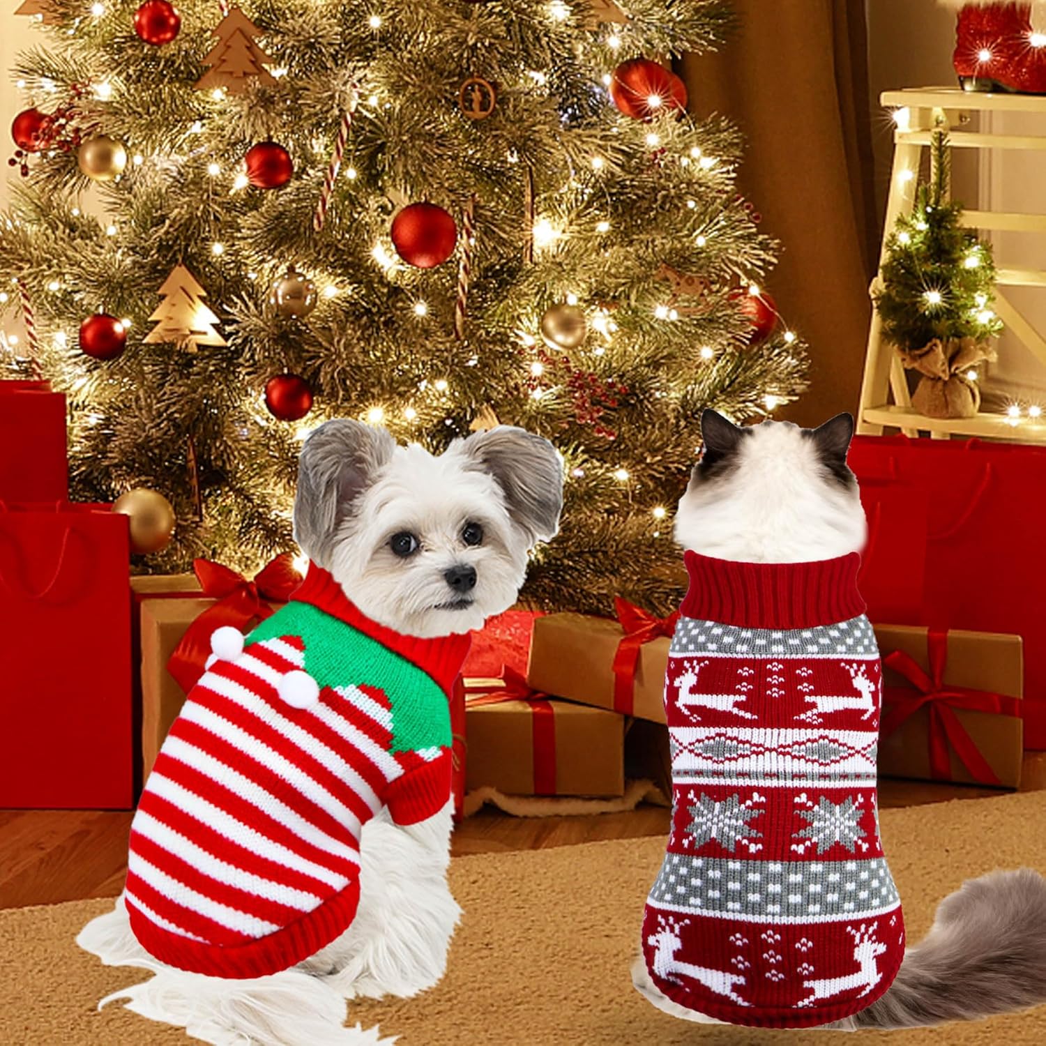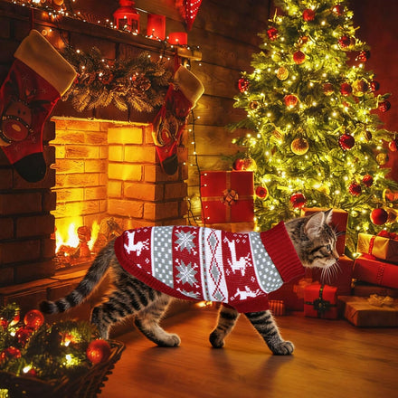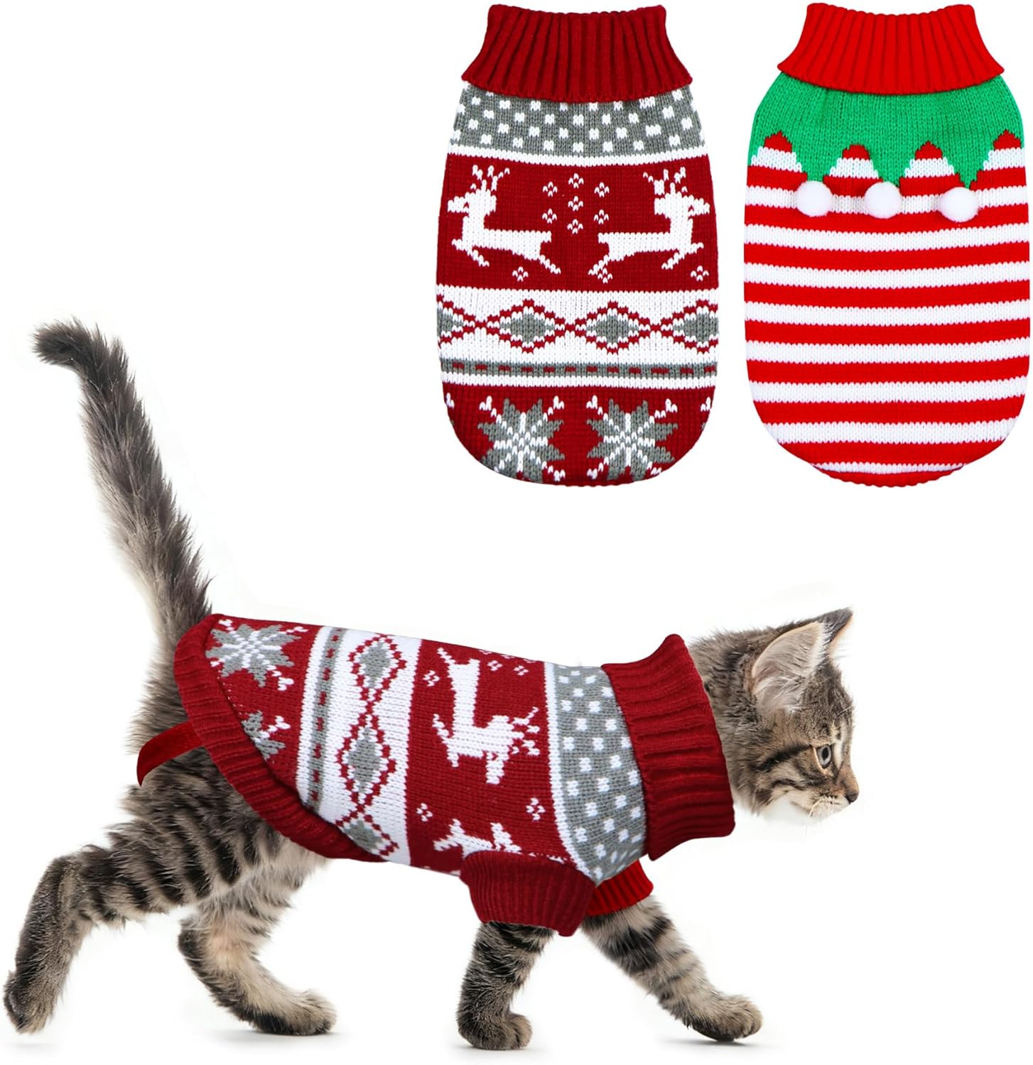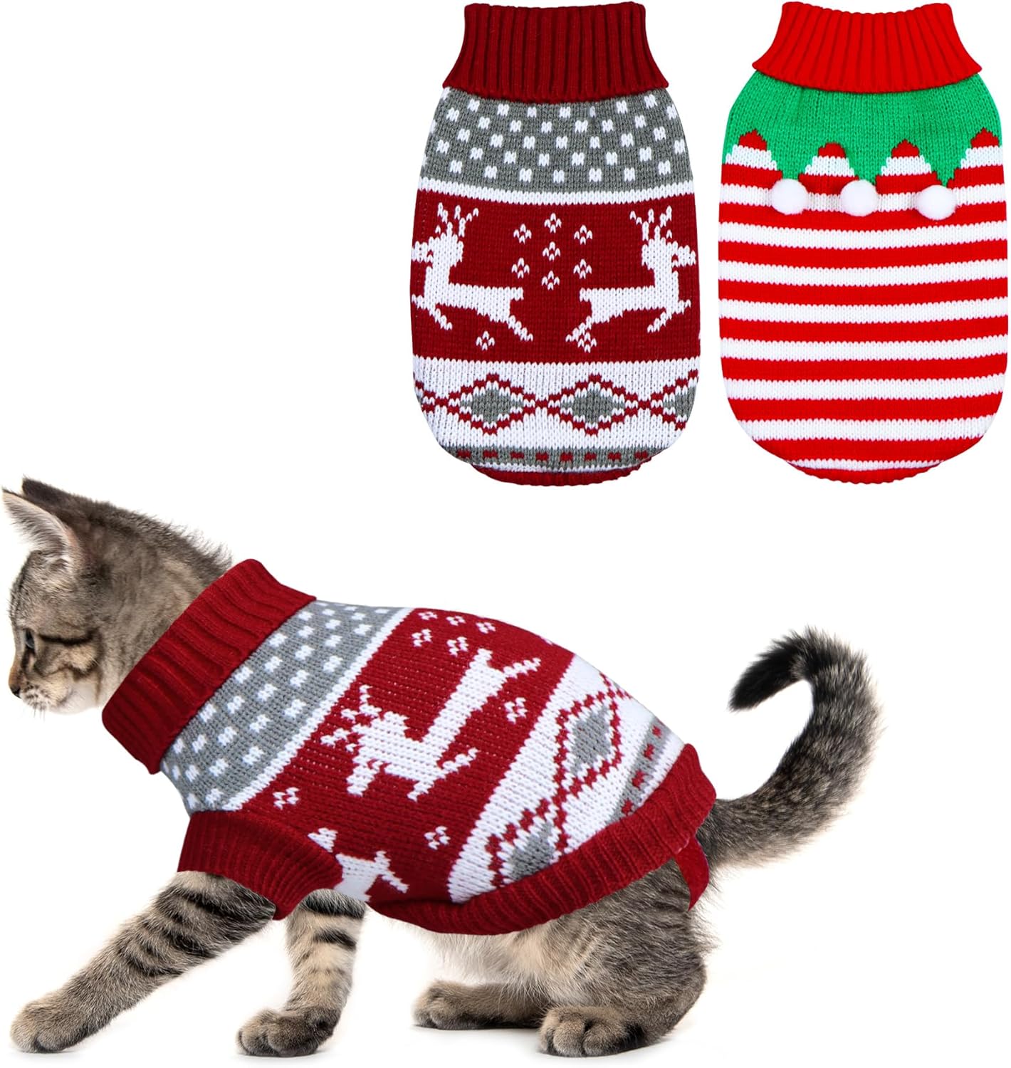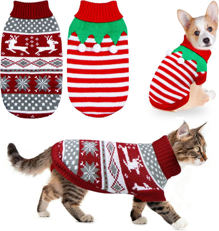 - Cat Christmas Sweater: This 2 pack of pet sweaters include 1 Christmas cat sweater with reindeer patterns in classic Christmas style, and 1 adorable cat Christmas sweater in elf style. The classic color matching design make it full of Christmas atmosphere. These cat/dog Christmas sweater will keep your pet warm and look adorable this Christmas!