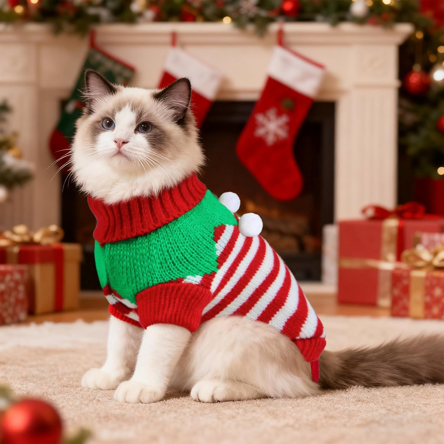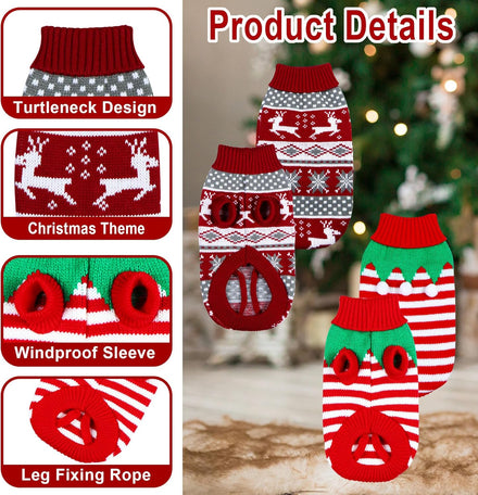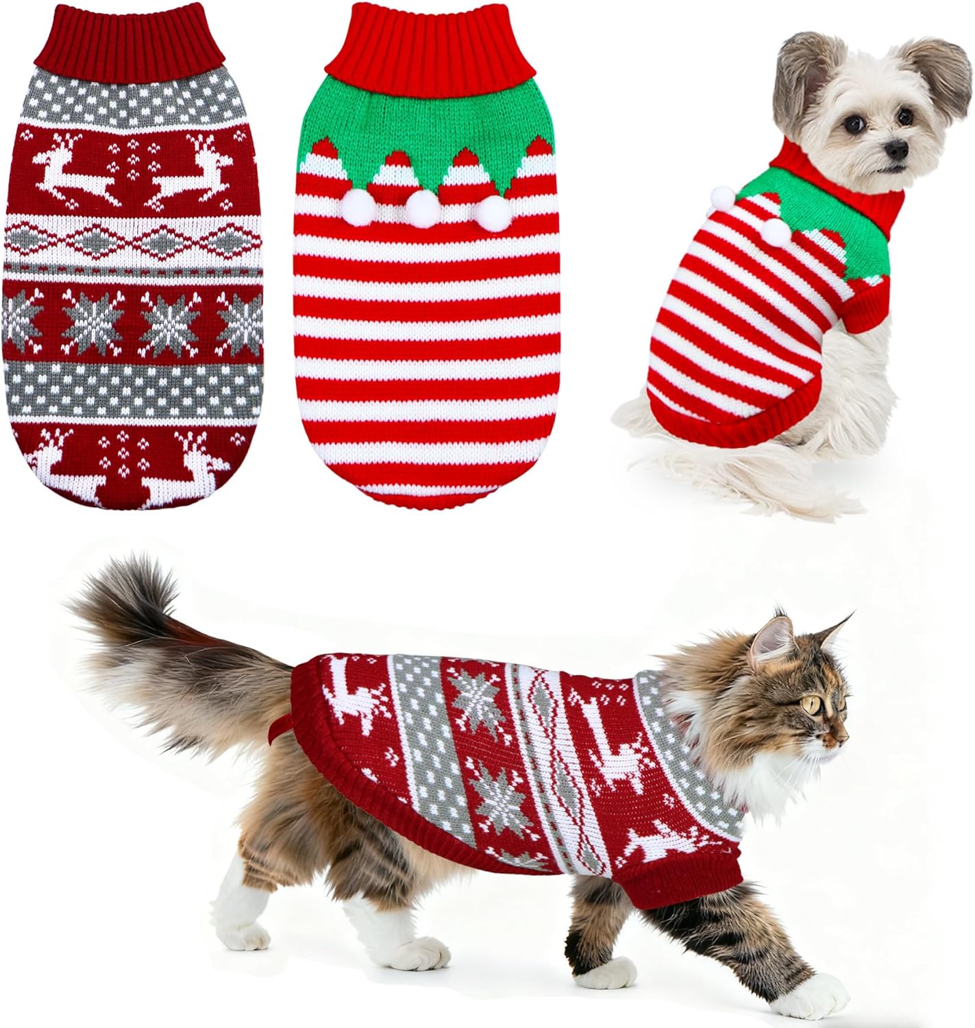 - Festival & Warm Design: The cat Christmas sweater is designed with classic reindeer, snowflake and cable patterns, full of Christmas atmosphere. Another one is designed with red and white stripe and cute green collar with 3 pompom balls.The turtleneck and sleeve design will keep your pet warm and protected from the wind this winter. With adorable and exquisite pattern, this pet dog Christmas sweater will make your pet stand out on Christmas!