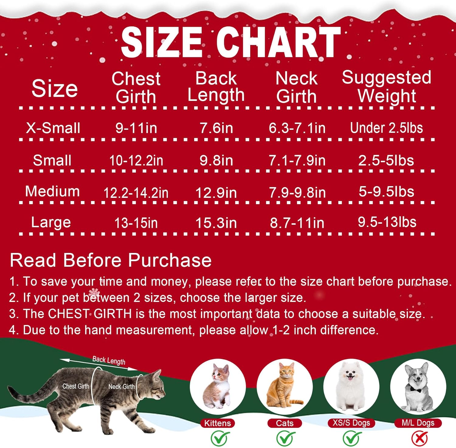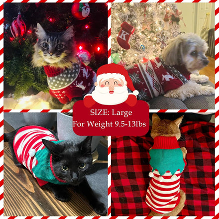 GOYOSWA 2 Pack Cat Christmas Sweater, Winter Knit Cat Sweaters Warm Coat Clothes Reindeer Snowflake Elf Christmas Sweater Outfit for Cats Kitten Puppy This 2 pack of pet sweaters include 1 Christmas cat sweater with reindeer patterns in classic Christmas style, and 1 adorable cat Christmas sweater in elf style. The classic color matching design make it full of Christmas atmosphere. These cat/dog Christmas sweater will keep your pet warm and look adorable this Christmas! Multiple Sizes for All Breed Sizes of Cats and Small Dogs: The X-Small Size: chest girth 9”-11”, neck girth 6.3”-7.1”, back length 7.6”, recommended for weight under 2.5lbs. The Small Size: chest girth 10”-12”, neck girth 7.1”-7.9”, back length 9.8”, recommended for weight 2.5-5lbs. The Medium Size: chest girth 12.2”-14.2”, neck girth 8.3”-9.8”, back length 12.9”, recommended for weight 5-9.5lbs. The Large Size: chest girth 13”-15”, neck girth 8.7”-11”, back length 15.3”, recommended for weight 9.5-13lbs. Kindly Notes: The pet sweater is designed in 4 sizes to fit all breed sizes of cats and small dogs. Please measure your pet size and refer to the size chart to choose the correct size before purchase. More Applications: These pet sweaters are ideals for cat Christmas gifts, cat Christmas outfit, dog Christmas outfit, dog Christmas gifts, Christmas Eve gifts, photo shots, daily wear and any occasions.