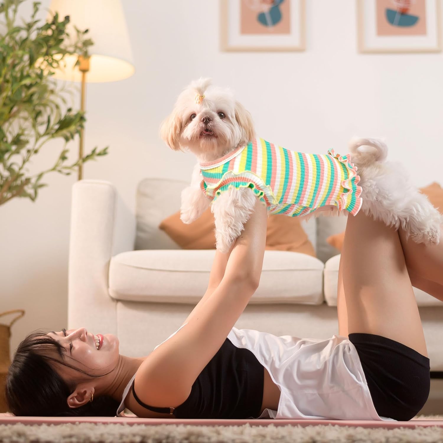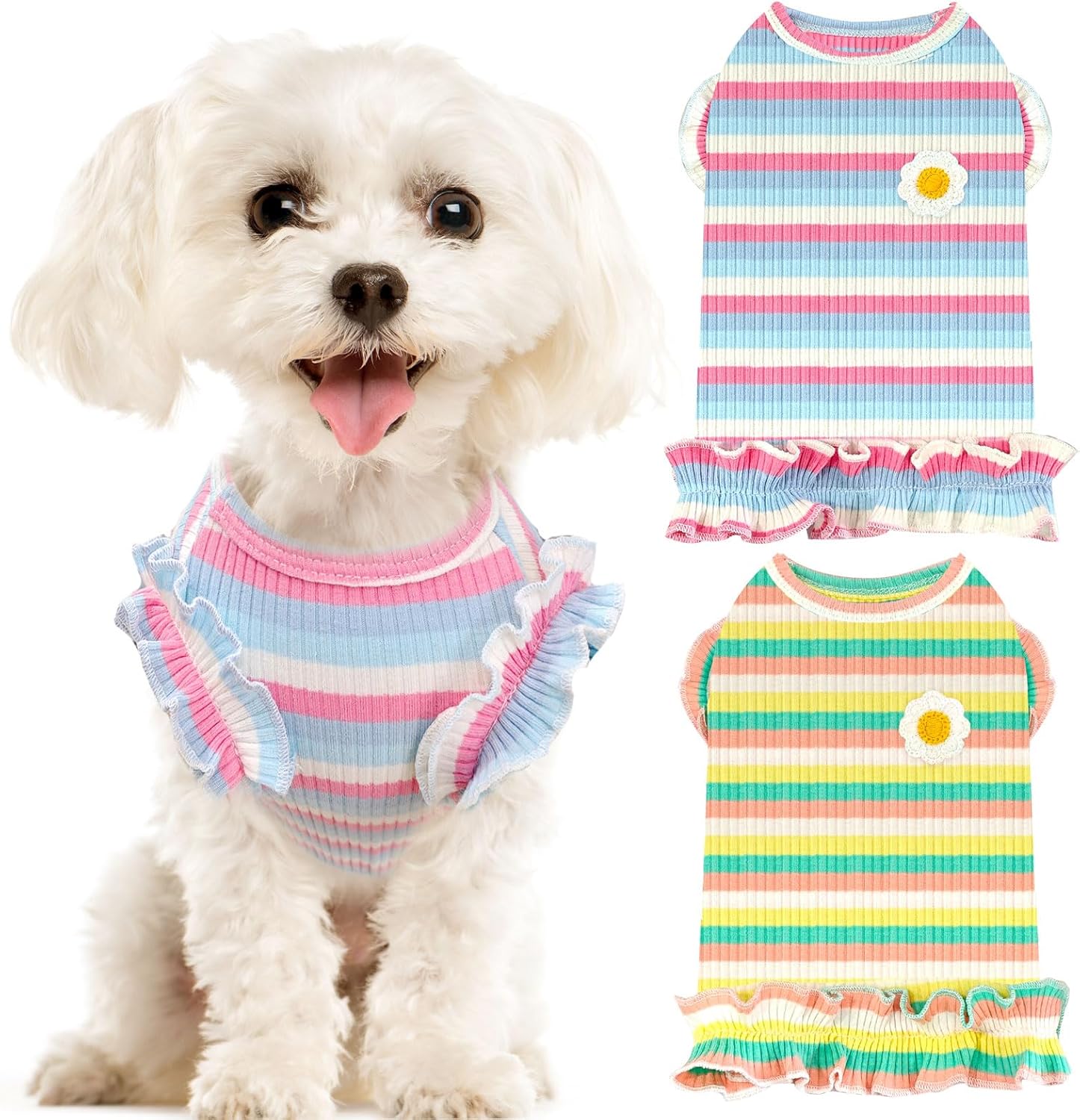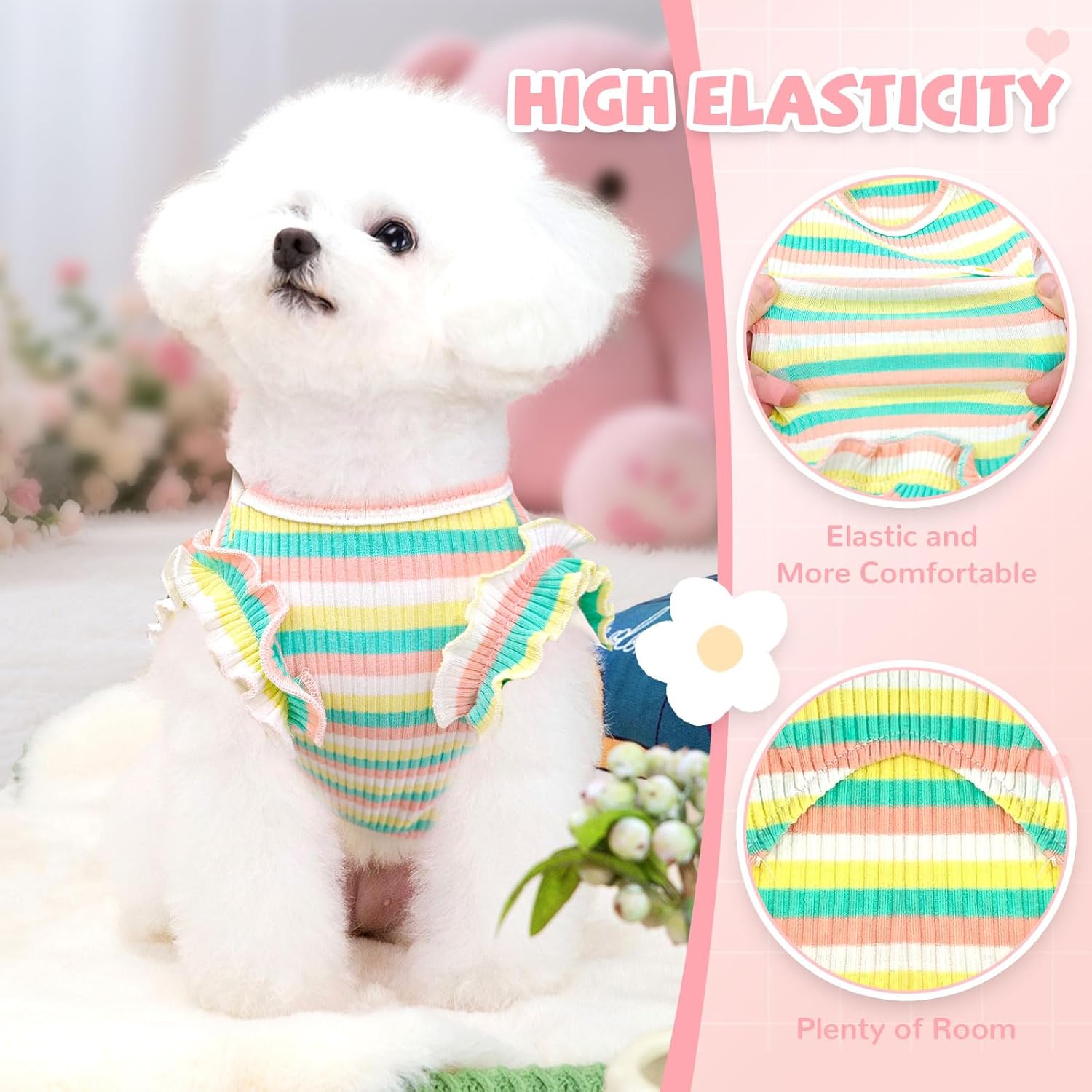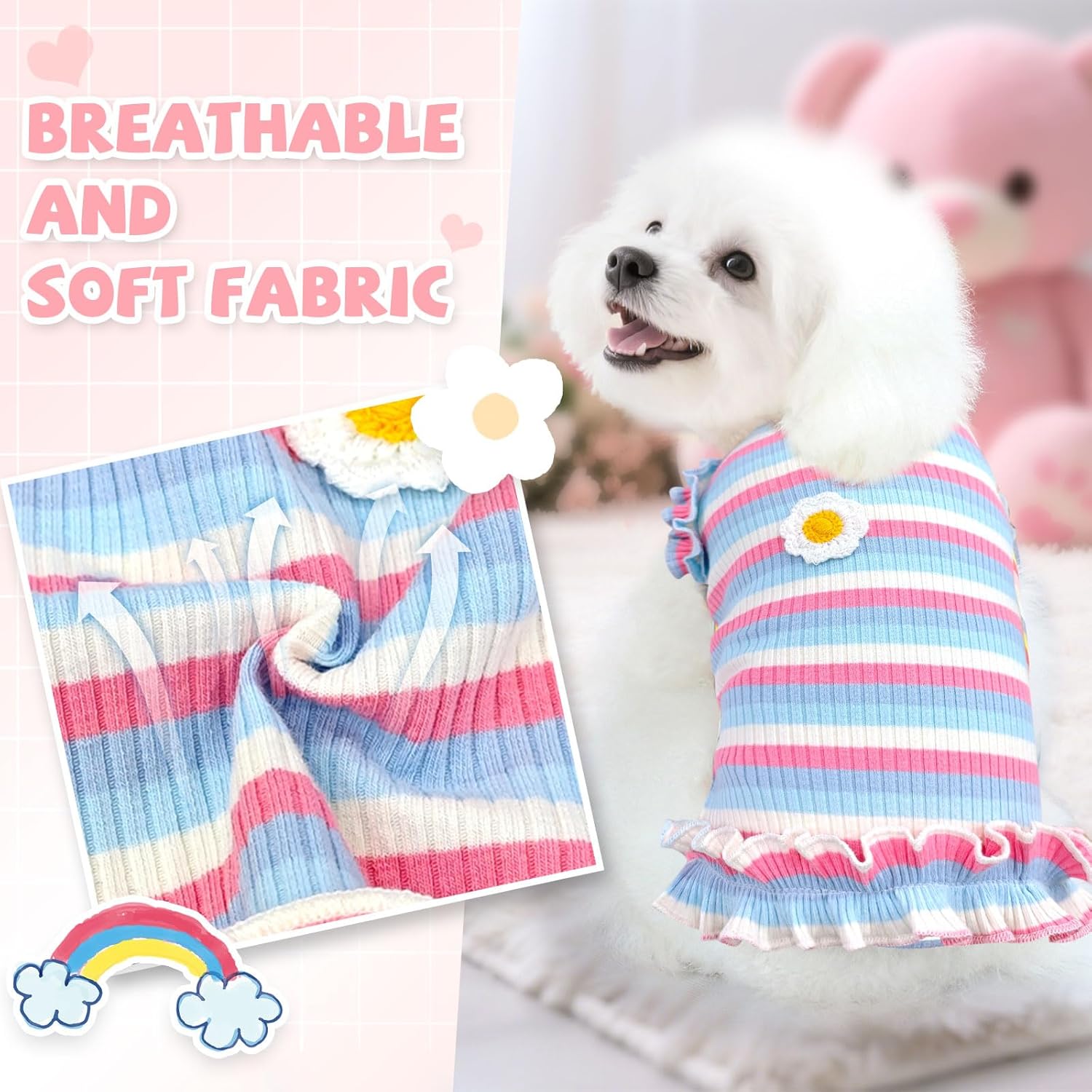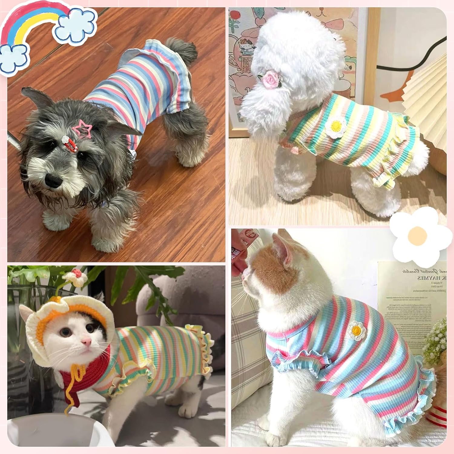 - Adorable 2Pcs Striped Dog T Shirts Set:Brighten your pup’s wardrobe with this cute striped dog shirt set, featuring a playful flower embroidery and airy flutter sleeves. Perfect for spring and summer
