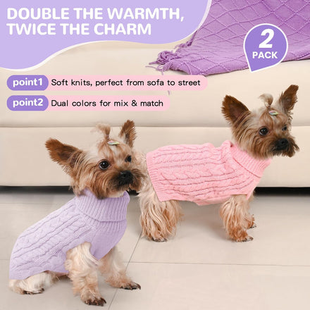 2 Pack Dog Sweaters for Small Dogs Winter Turtleneck Pullover Cable Knit Fleece Stretch Puppy Doggie Chihuahua Toy Poodle Yorkie Pomeranian Boy Girl Pet Clothes (S, Pink & Purple)
