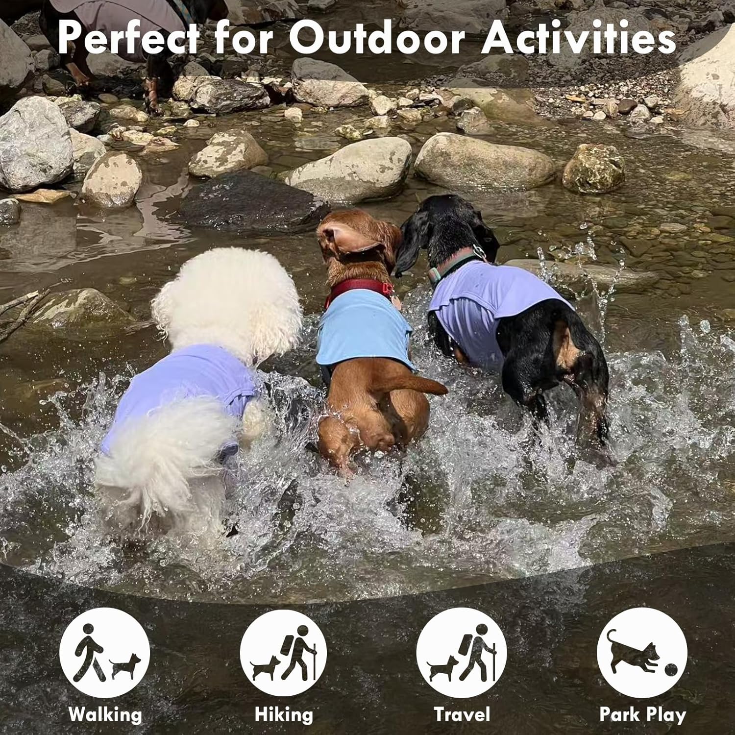 - Cooling Dog T-shirt: This vest keeps dogs cool in hot weather, and helps regulate temperature to prevent overheating. Ideal for outdoor activities like summer walking, beach trips, hiking, camping, travel, park play, adventure, training