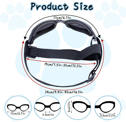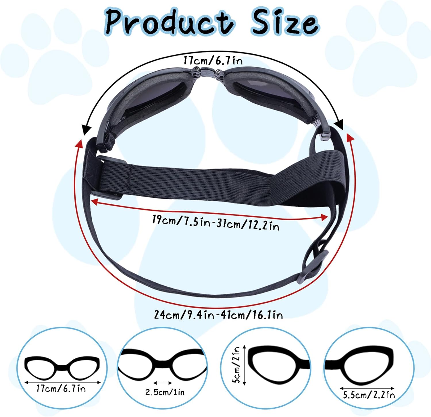 - Adjustable Design: Our dog sunglasses comes with an adjustable chin and headband design, which ensures a good wearing comfort and fit regardless of your dog's head shape or size. The head strap has a wide range of adjustability from 24cm/9.4 inches to 41cm/16.1 inches, while the chin strap extends from 19cm/7.5 inches to 31cm/12.2 inches, which fully meets the individual needs of dogs of different sizes. Ideal for most dogs, these dog glasses make every outdoor activity a pleasant experience
