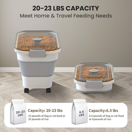 • Space Save & Extra-large Size: This dog food bin can hold 20-30 lbs of rice or 20-23 lbs of pet food. Unfolded size:16.54"L x 10.15"W x 12"H, suitable for storing 35 pounds of rice or 23 pounds of dog food. Folded size:16.54"L x 10.15"W x 5.5"H, can hold about 10 pounds rice or 6.5 pounds of dog or cat food.