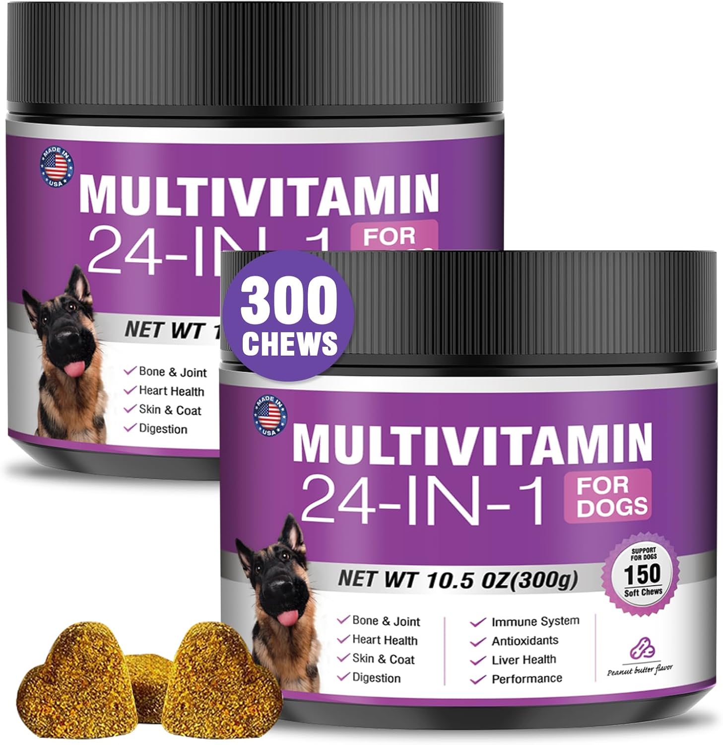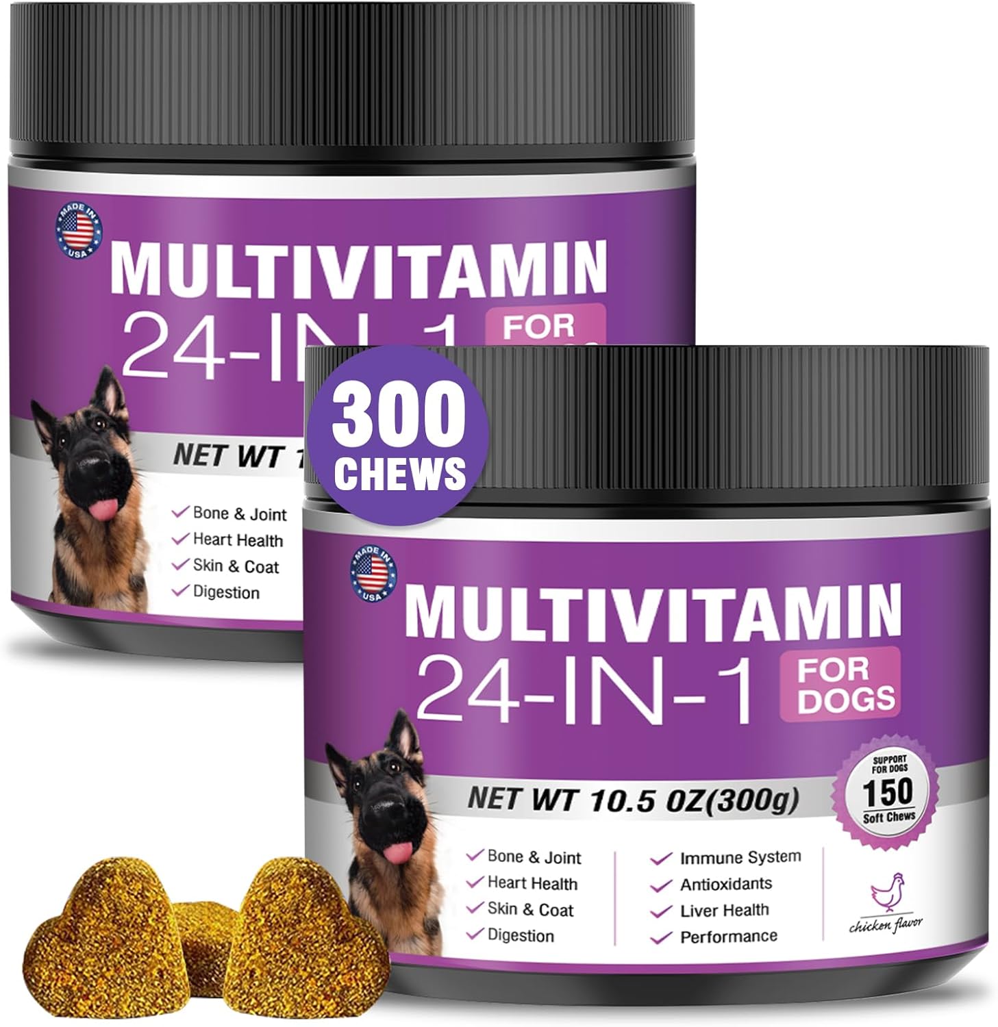 - Dog multivitamin chews protect overall health:Senior dog vitamins and supplements help improve blood circulation and prevent cardiovascular disease.Dog multivitamins chewable support normal liver function,promote liver detoxification,and improve negative mood.For dog with heart problems and older dog,taking dog vitamins and supplements in moderation is an auxiliary health care measure.Dog vitamins multivitamin helps enhance white blood cell activity,improve immunity,prevent infection and disease