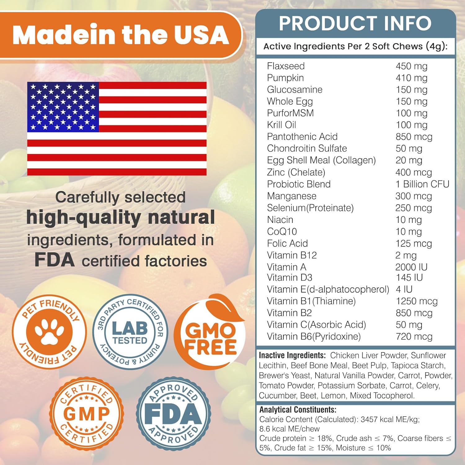 - Dog multivitamin chews are good for the gut: dog vitamins and supplements are made in the USA from natural ingredients. Dog vitamins multivitamin chewables contain a rich blend of probiotics to support intestinal and digestive health. Dog vitamins for small dogs can regulate the balance of intestinal flora, help calcium absorption, and promote bone development. Dog multivitamins chewables improve energy metabolism, converting food into energy, making dogs more energetic in their daily activities