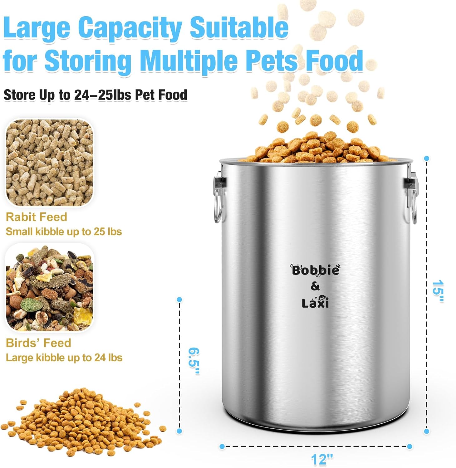 - Extra Large Capacity for All Your Pet Food Needs: This 25 Lbs large capacity air tight dog food storage container is highly suitable for families with large dogs or multiple pets. It can not only store dog food but also easily accommodate various pet foods such as cat food, rabbit food, and bird seed. It completely solves the problem of pet food being scattered and messy around the house, keeping your home tidy and organized.