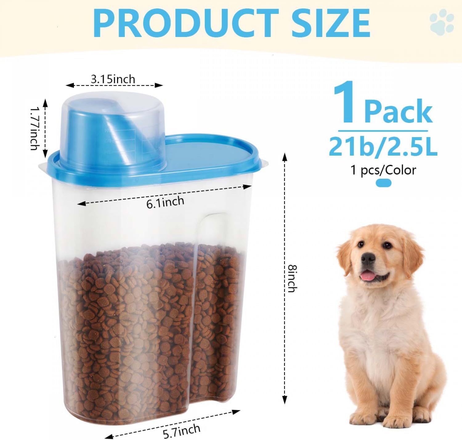 - More Capacity: After purchase, you will get 1 packs 2lb / 2.5L pet food storage container (blue), 6.3x4.13x14.17inch, which has a larger capacity than others and you can store more food for your pets