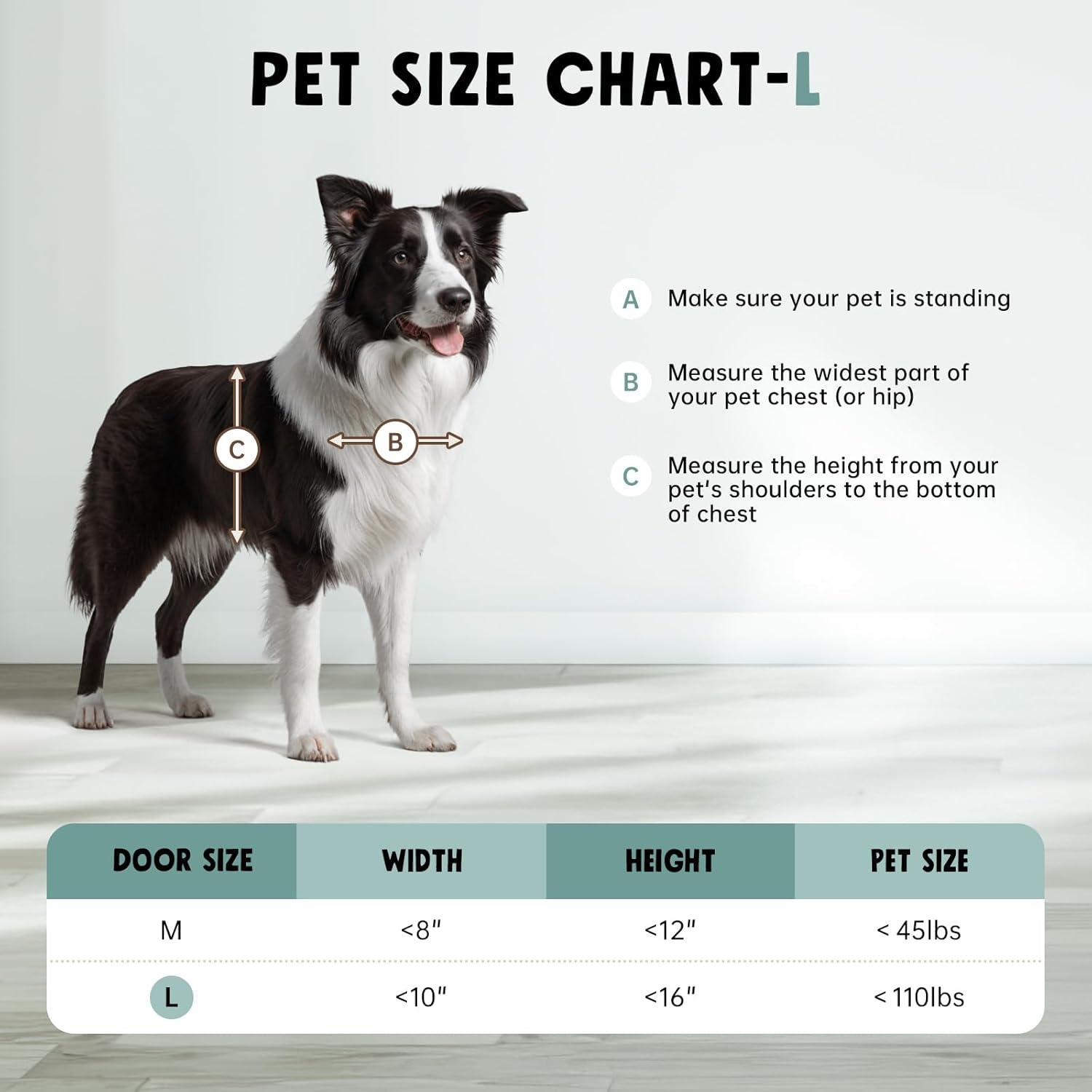 - Two Size Dog Doors:The Large Dog Door features a spacious 18.7 x 9.92 inch flap opening.It is suitable for large dogs weighing up to 110 pounds.When you make a hole in the wall, the opening in the wall measures 10.6 x 18.9 inches.It features an expandable channel that can accommodate walls from 3.95 to 7.5 inches thick.Please compare the size chart to make sure the size is right for your dog before purchase