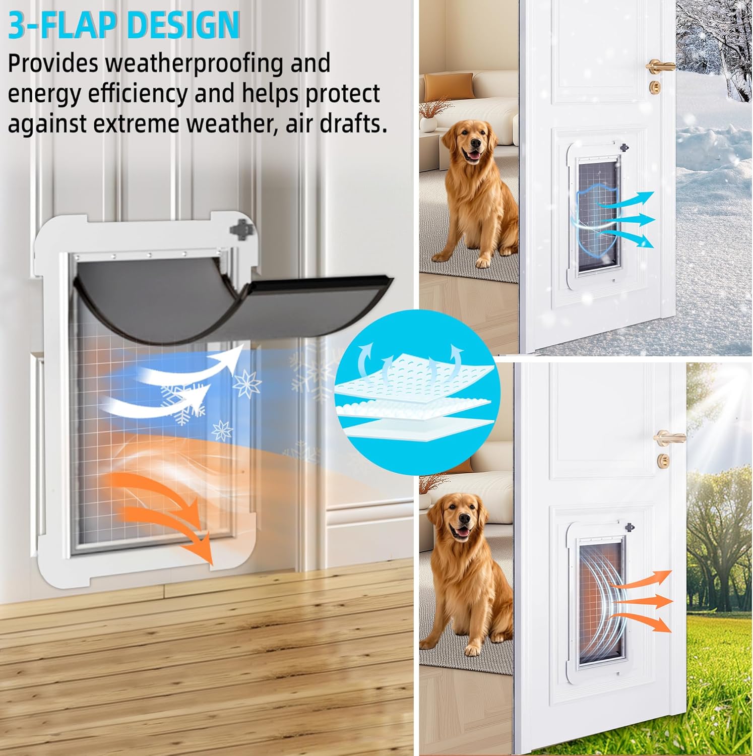 - 3-FLAP Dog Door for Exterior Door: Built with a sturdy steel frame and an steel sliding lock, this doggy door is designed to withstand daily use and all weather conditions, ensuring long-lasting performance