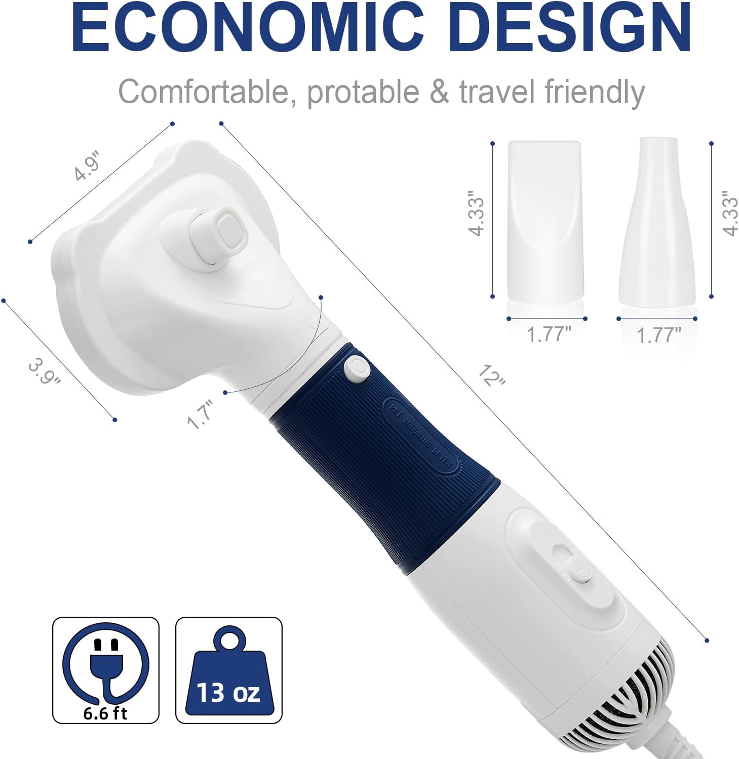 - 【Perfect for Small-Sized Dogs and Cats】This portable 300W pet hair dryer dries your pets quickly, saving energy and suitable to prevent pain and burn.For larger dogs, it's great for providing warmth and comfort during brushing, though not suitable for fully drying. Towel-drying beforehand is recommended to reduce overall drying time.