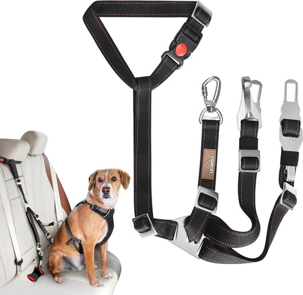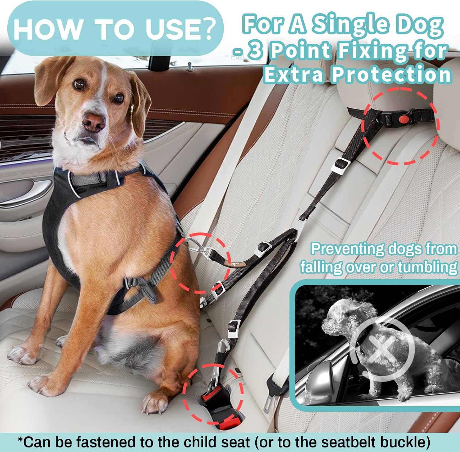 - 【Premium Protection】- This dog car harness offers top and bottom three-directional fixation when used for a single dog,the top loop can be easily attached to the rear seat pillow, and there is a latch to adjust the size of the loop to keep it stable. The bottom two latches can be fastened to the child seat (or to the seatbelt buckle of the human seat),providing superior stability and preventing dogs from falling over or tumbling down, ensuring high safety.