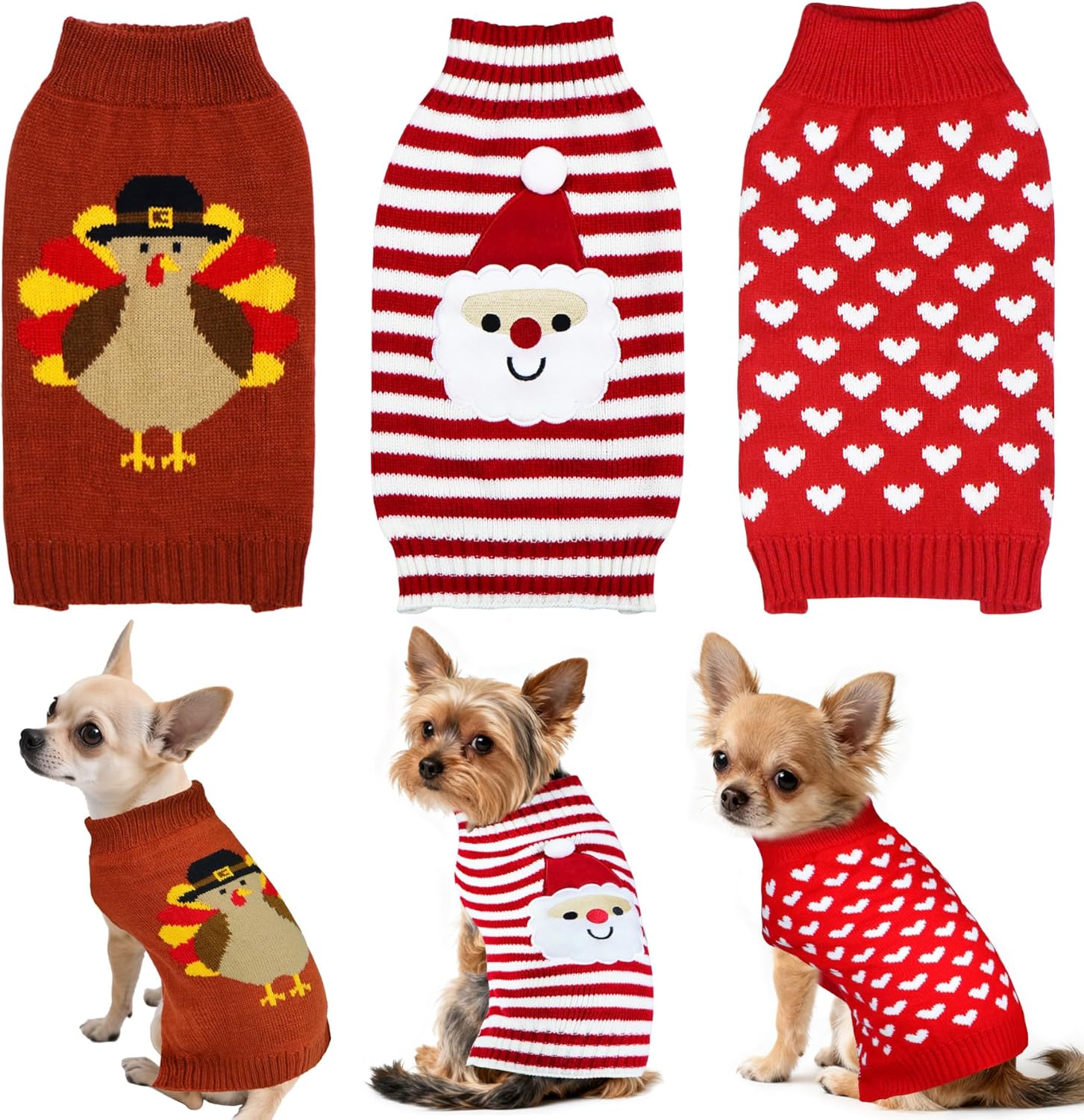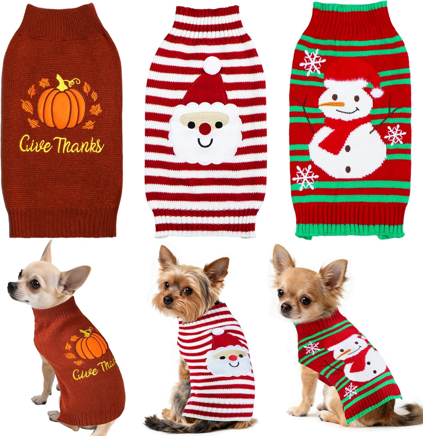 PAYHTOW 3 Pack Dog Christmas Sweater, Knit Dog Sweaters Santa Reindeer Snowman Christmas Sweater Outfit Clothes for Small Medium Large Dogs Pets This holiday season, give your furry family member the gift of style, warm, and togetherness. Our delightful 3 pack Dog Christmas Sweaters are designed to make your pup an integral part of the festivities, creating unforgettable memories and picture-perfect moments. Design & Style: Celebrate in Themed Comfort Your dog will be the best-dressed guest at the holiday party! This special set includes 3 uniquely charming sweaters to mix and match: · The Christmas Santa Dog Sweater: A classic red and white sweater adorned with a cute santa, immerse your pup in the Christmas atmosphere instantly. · The Christmas Snowman Dog Sweater: A stylish red and green sweater designed with a snowman pattern, keep your pet warm and enjoy holiday with your family. · The Christmas Reindeer Dog Sweater: A classic red and white sweater adorned with a cute reindeer, immerse your pup in the Christmas atmosphere instantly. With 3 options, your pup can have a fresh look for every holiday event or you can coordinate outfits if you have multiple dogs! Multiple Sizes Designed: Small Size: Chest Girth: 13”, Back Length: 10”, Neck girth: 8”, recommended for large cats, x-small dogs and small dogs Medium Size: Chest Girth: 15”, Back Length: 11.5”, Neck girth: 10”, recommended for small dogs. Large Size: Chest Girth: 20”, Back Length: 15”, Neck girth: 12”, recommended for small and medium dogs. X-Large Size: Chest Girth: 22”, Back Length: 17”, Neck girth: 15”, recommended for medium and large dogs. Friendly Notes: 5.Please refer to the size chart and choose the correct size for your pets. 6.Due to the hand measurement, please allow 1-2 inch difference. Premium Quality: Superior Softness & Warmth We chose a high-quality acrylic knit fabric: · Incredibly Soft: Gentle against your dog's skin, preventing any irritation or itchiness. · Effectively Warm: Provides excellent insulation against the autumn and winter chill. · Durable & Easy Care: Maintains its shape and vibrant colors wash after wash, making holiday prep easy.