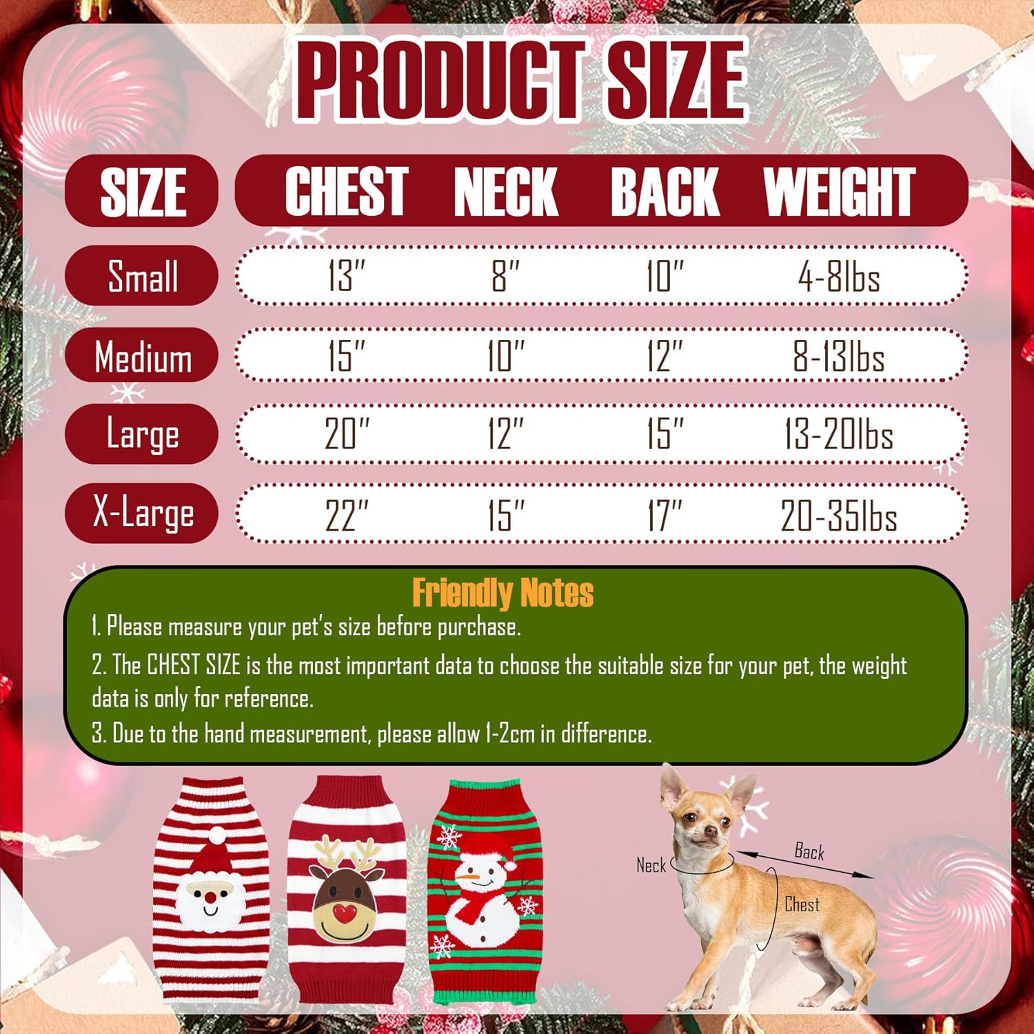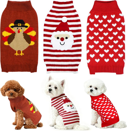 PAYHTOW 3 Pack Dog Christmas Sweater, Knit Dog Sweaters Santa Reindeer Snowman Christmas Sweater Outfit Clothes for Small Medium Large Dogs Pets This holiday season, give your furry family member the gift of style, warm, and togetherness. Our delightful 3 pack Dog Christmas Sweaters are designed to make your pup an integral part of the festivities, creating unforgettable memories and picture-perfect moments. Design & Style: Celebrate in Themed Comfort Your dog will be the best-dressed guest at the holiday party! This special set includes 3 uniquely charming sweaters to mix and match: · The Christmas Santa Dog Sweater: A classic red and white sweater adorned with a cute santa, immerse your pup in the Christmas atmosphere instantly. · The Christmas Snowman Dog Sweater: A stylish red and green sweater designed with a snowman pattern, keep your pet warm and enjoy holiday with your family. · The Christmas Reindeer Dog Sweater: A classic red and white sweater adorned with a cute reindeer, immerse your pup in the Christmas atmosphere instantly. With 3 options, your pup can have a fresh look for every holiday event or you can coordinate outfits if you have multiple dogs! Multiple Sizes Designed: Small Size: Chest Girth: 13”, Back Length: 10”, Neck girth: 8”, recommended for large cats, x-small dogs and small dogs Medium Size: Chest Girth: 15”, Back Length: 11.5”, Neck girth: 10”, recommended for small dogs. Large Size: Chest Girth: 20”, Back Length: 15”, Neck girth: 12”, recommended for small and medium dogs. X-Large Size: Chest Girth: 22”, Back Length: 17”, Neck girth: 15”, recommended for medium and large dogs. Friendly Notes: 5.Please refer to the size chart and choose the correct size for your pets. 6.Due to the hand measurement, please allow 1-2 inch difference. Premium Quality: Superior Softness & Warmth We chose a high-quality acrylic knit fabric: · Incredibly Soft: Gentle against your dog's skin, preventing any irritation or itchiness. · Effectively Warm: Provides excellent insulation against the autumn and winter chill. · Durable & Easy Care: Maintains its shape and vibrant colors wash after wash, making holiday prep easy.