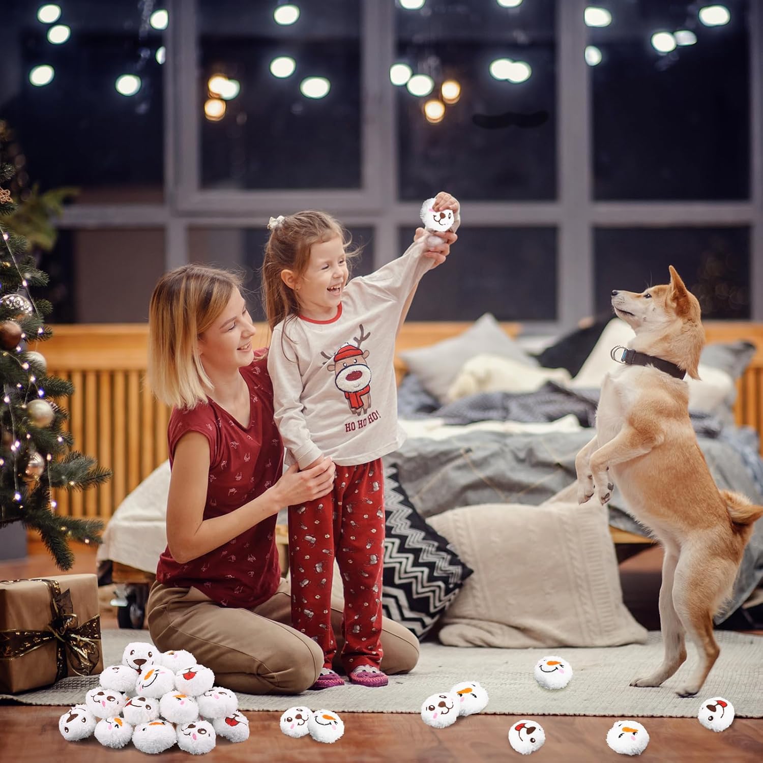 32 Pcs Christmas Dog Toys Squeaky Plush Balls, Soft Puppy Snowball with Dog & Snowman Smile, Christmas Pet Squeaker Fluffy Ball for Interactive Small & Medium Dogs, Xmas Toys Party Decorations