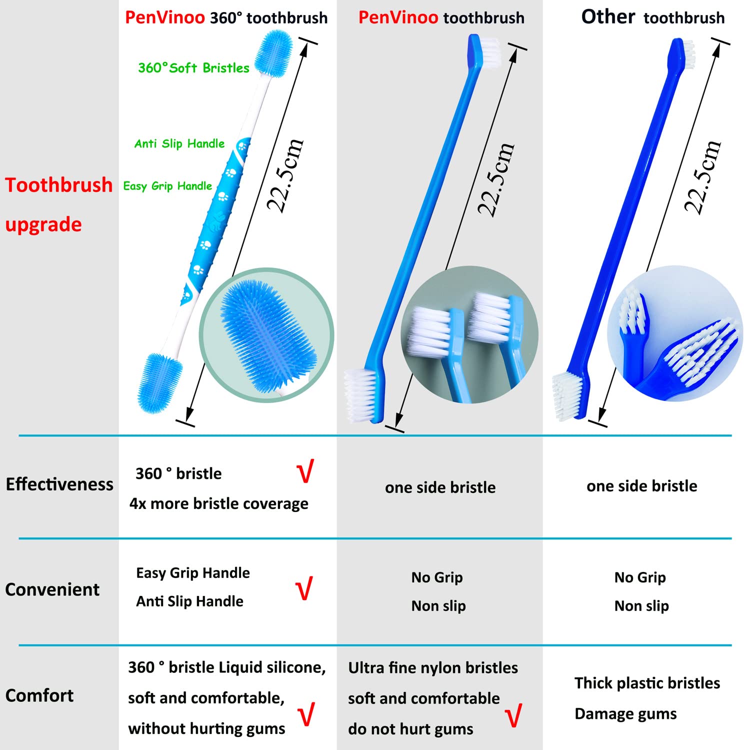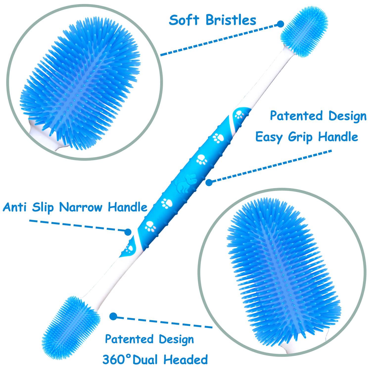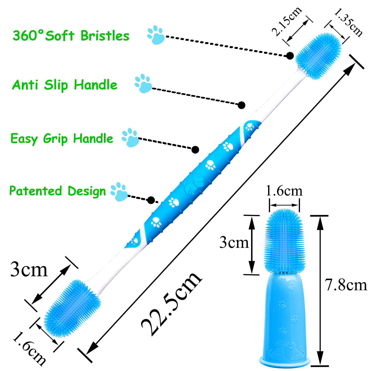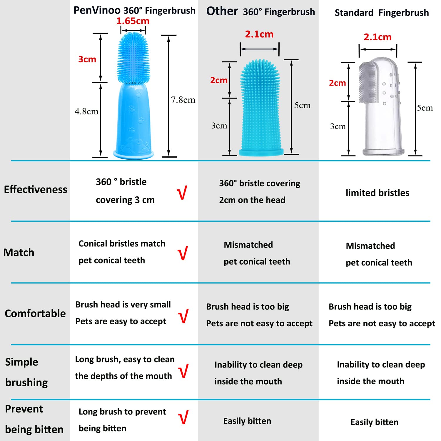 360º DESIGN - Patented design,360 ° silicone fingerbrush, soft and comfortable,pet mouth is conical, conical bristle fits perfectly with pet mouth,Pets are easy to accept. This finger brush is 2.7cm longer than the traditional finger brush, it is easy to clean the deep part of pet's mouth, and it can prevent fingers from being bitten by pets.