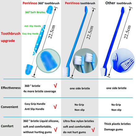 Great value set ( For the price of one set, you will get 3 sets) : include 3 types, 4 pcs 360 ° silicone finger brush,4 pcs 360 ° Dual Headed silicone handle toothbrush,4 pcs of 2 finger dog toothbrush durable, washable and air-dried for repeated use(1 set for 2 finger toothbrush).