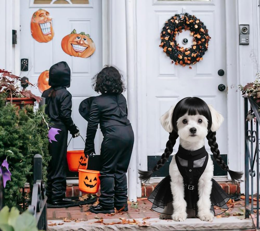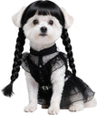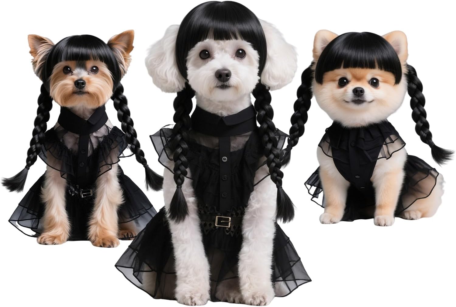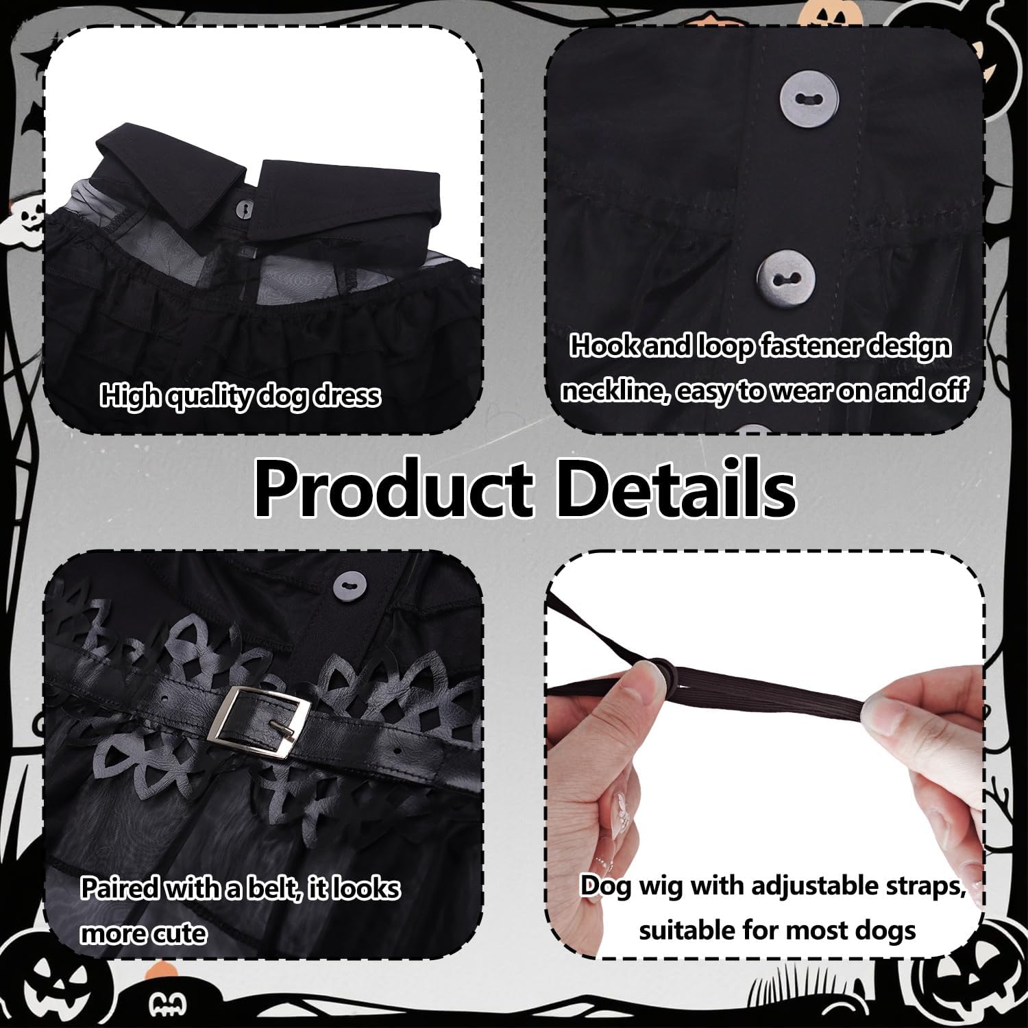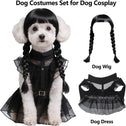 - Complete & Charming Pet Dog Costume Set: Dress your pet to impress with our comprehensive puppy kitten clothes set. Includes a black dress made of soft yarn, a matching adjustable wig and a adjustable belt for a cohesive and adorable Halloween or party look. Everything needed for instant pet glamour