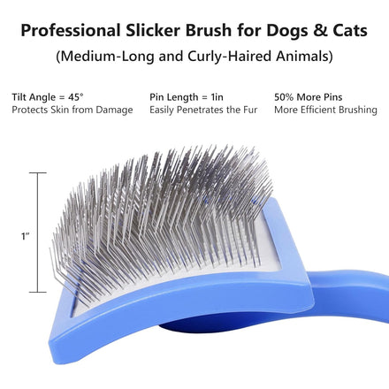 - 【Professional Slicker Brush for Dogs】Designed for medium-length and curly-haired pets with thick, difficult-to-manage coats, our slicker brush features extra-long angled pins that penetrate deeply to remove dead hair and loose undercoat. It is the best choice for deep combing undercoat for Goldendoodles, Poodles, Labradoodles, etc.Ergonomic handle minimizes hand and arm fatigue during grooming sessions, making it an essential tool for shedding season