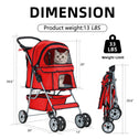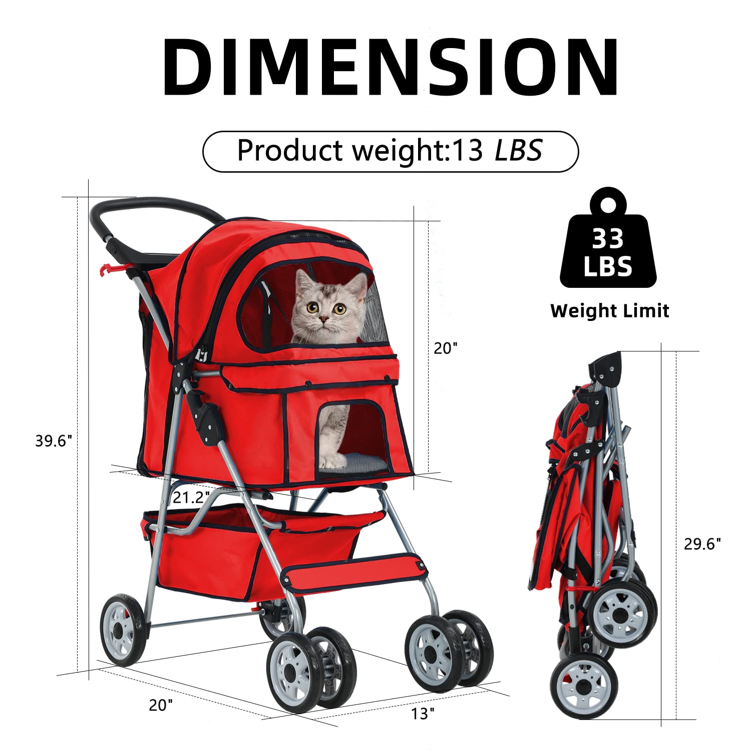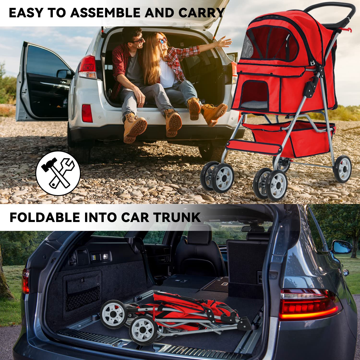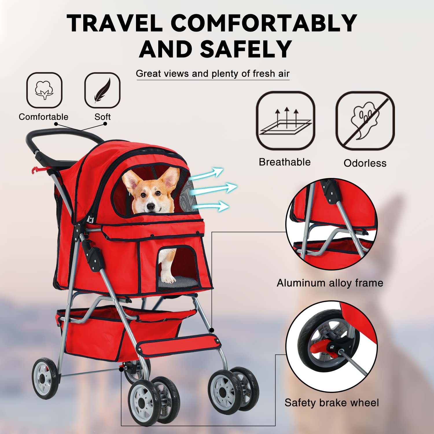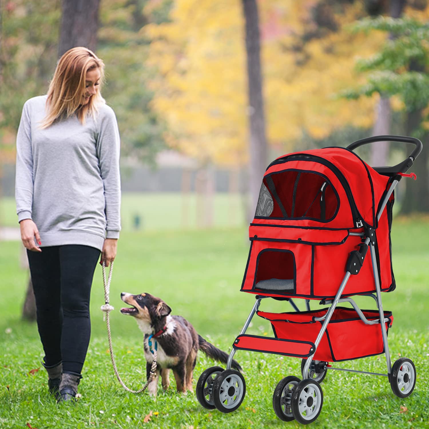 4 Wheels Pet Stroller, Pet Dog Cat Jogger Stroller, Folding Carrier Waterproof Puppy Stroller with Cup Holder & Removable Liner, Dog Strollers for Small Dogs, for Small and Medium Pet Supplies (Red)