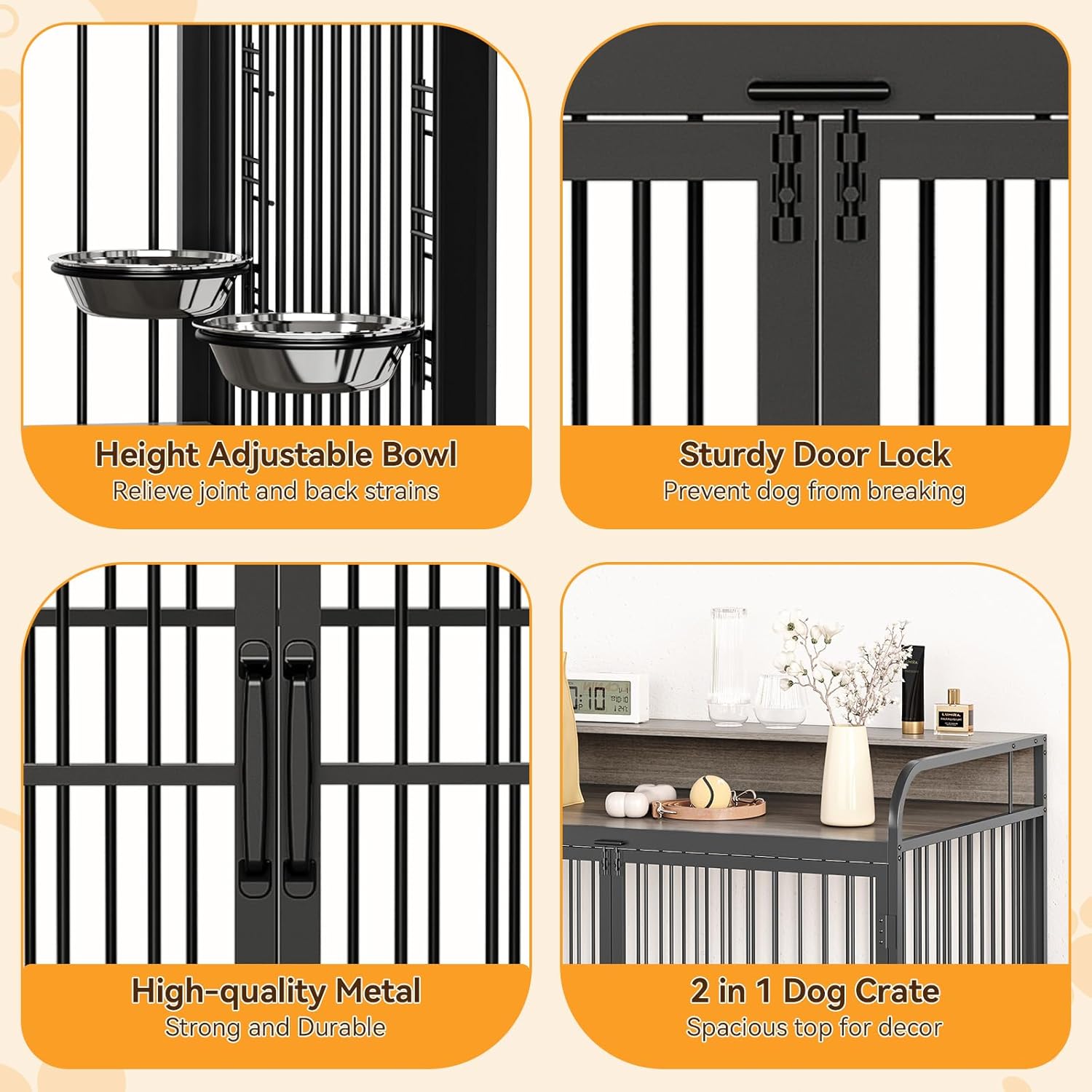 - Stylish Home Integration: This dog crate furniture effortlessly combines aesthetics with functional pet containment. The wood-look dog crate features sleek metal framing that transforms from practical pet space to stylish home accent, eliminating the industrial look of standard crates while providing the same secure enclosure.