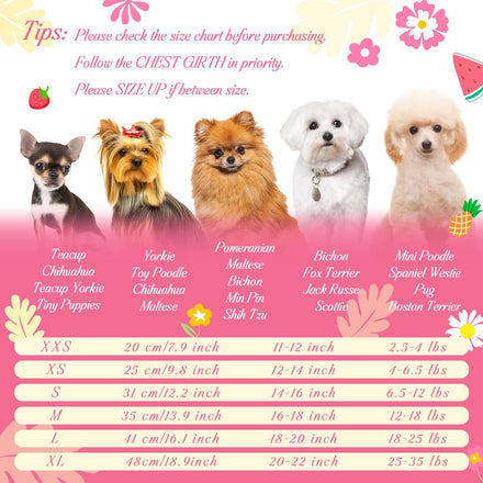 Dog Summer Dress: Our girl dog clothes fits most different size dogs. Please kindly check the back size, chest size of your baby pets before you place the order. The 5 dog dresses is available in a variety of styles, sleeveless design and button design can make it easy for your dog to put on and take off. The cute various print of summer elements can make your dog be the most charming and energetic one in this summer