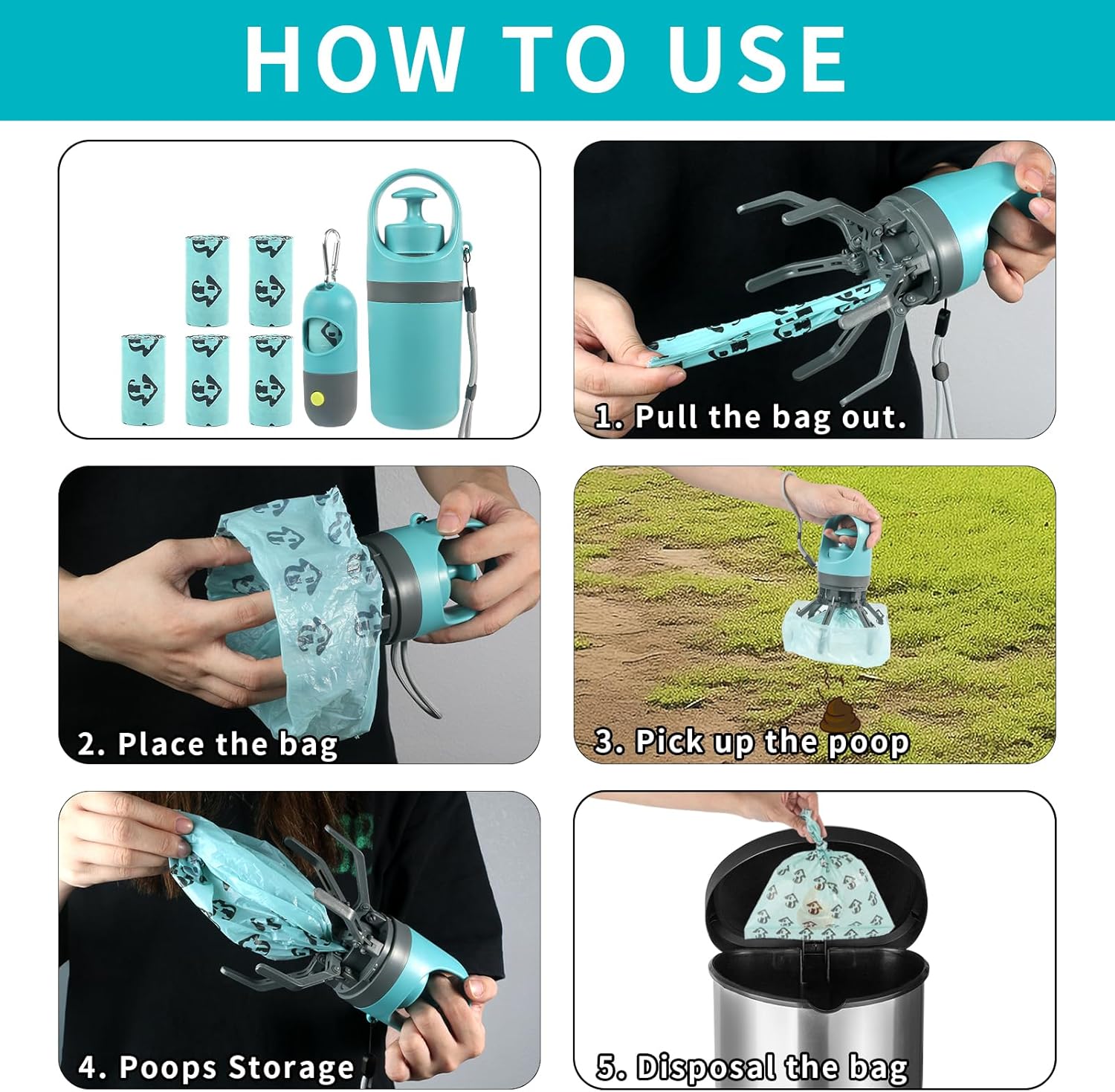 - Comprehensive Pet Waste Solution: A convenient and complete solution for pet waste management. This set includes a Portable Dog Poop Scooper, a Pooper Bag Dispenser with LED Flashlight, and 6 rolls of waste bags, totaling 90 bags to keep you prepared