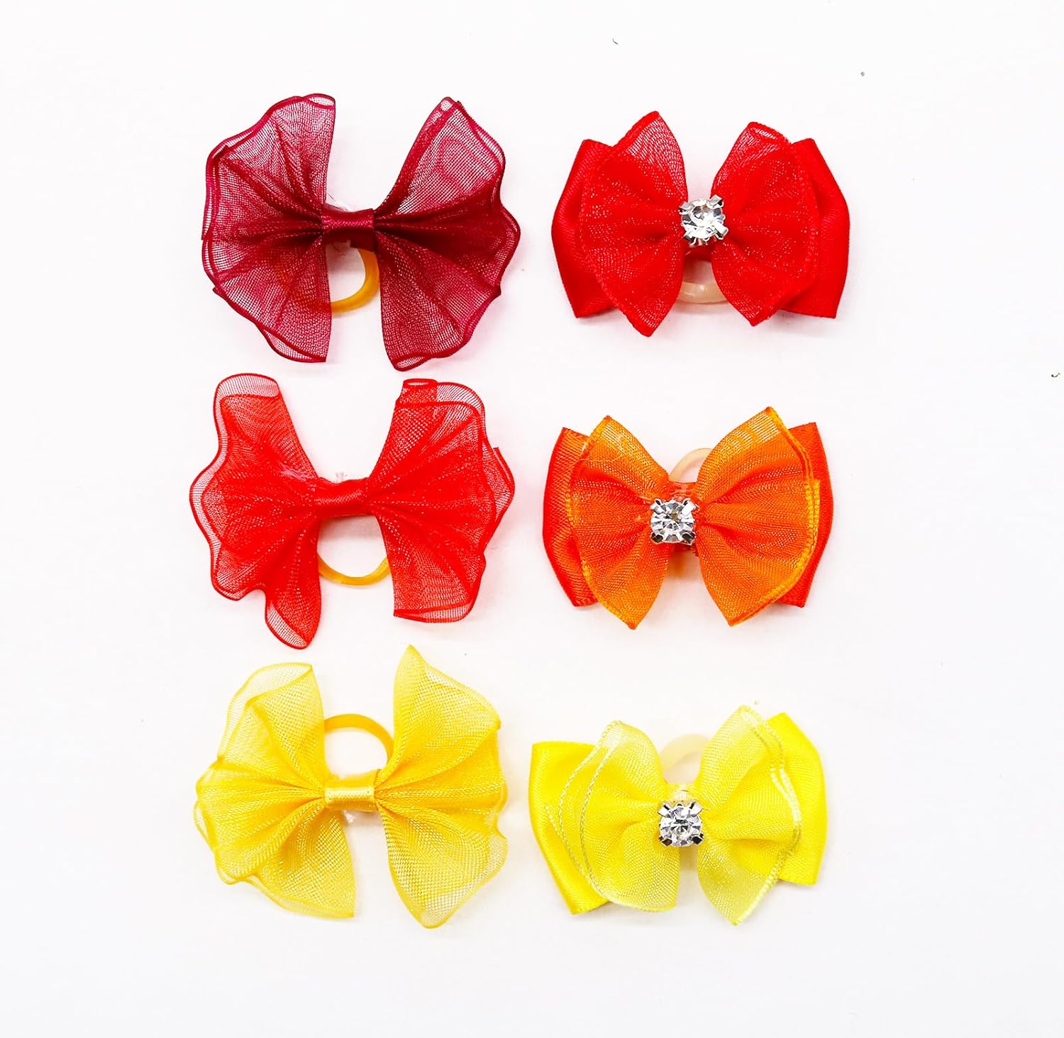 - The pet hair bow is made of threaded ribbon, Organza, rhinestones and has a rubber band on the back. Organza this delicate yarn material has a dreamy feel ,this must a unique decoration .