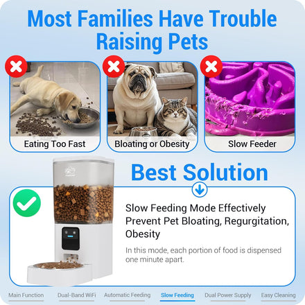 - Slow Feeding Mode : Frienhund's upgraded automatic cat feeder has a complete set of solutions for pet feeding, which can solve various problems in pet feeding and help pet owners feed their pets more scientifically. After turning on the slow feeding mode, your feeding schedule will produce a portion of food every minute, which can effectively prevent pets from eating too fast, regurgitation, bloating and obesity. You don't have to worry about your pet always biting the slow feeding bowl.