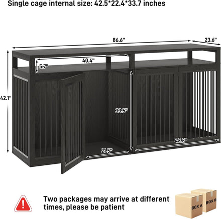 - Sturdy and Bite-Resistant: Our large dog crate furniture, which accommodates 2 dogs, is made of medium-density fiberboard, iron, and metal iron tube. More stable and bite-resistant than other dog crates, this one provides stable and secure space for your pet. Overall dimensions: 86.6 x 23.6 x 41.9 inches. Internal dimensions of a single crate: 42.86 x 33.9 inches