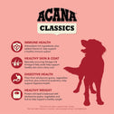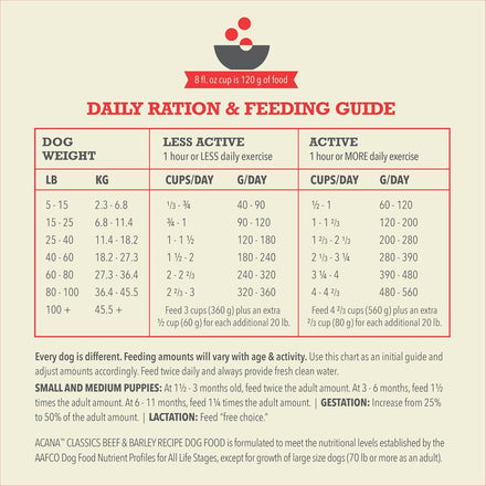 Nurture your dog with the simple nutrition and wholesome ingredients in ACANA™ Classics Beef & Barley Recipe dog food. This dry dog food is crafted with protein-rich farm-raised beef balanced with wholesome grains, vegetables and fruit. That means this nutritious kibble is also packed with nutrients, not fillers. Your dog will love the delicious taste of this ACANA dog food kibble, and you’ll love its nutritious ingredients. This dry dog food also helps support 4 key health benefits, including Immune Health, Healthy Skin and Coat, Digestive Health and Healthy Weight. Nourish your dog with quality nutrition fresh from our kitchen with ACANA dog food! *Retailer decides price. Based on MSRP, average cost per day for large bag of ACANA Classics Beef & Barley Recipe, feeding 40lb dog.