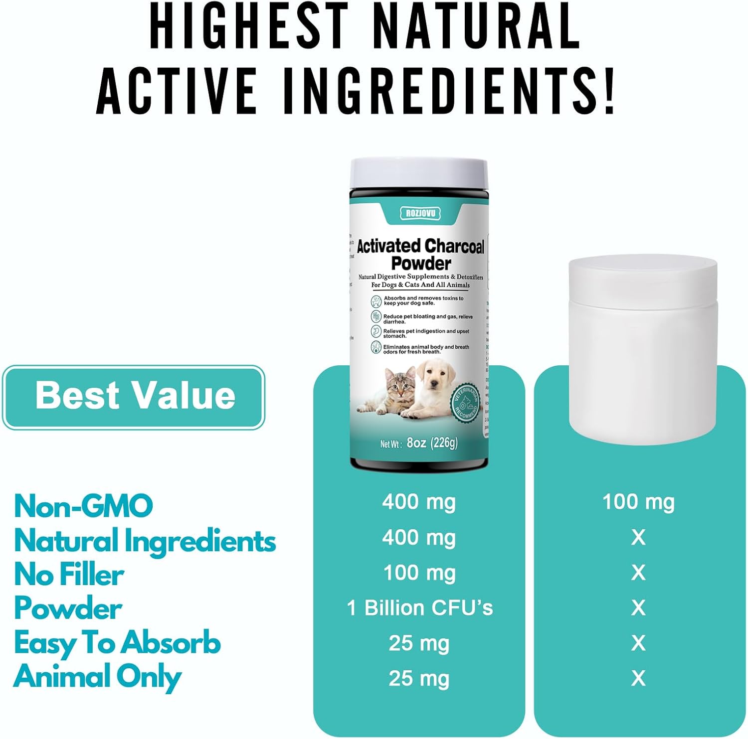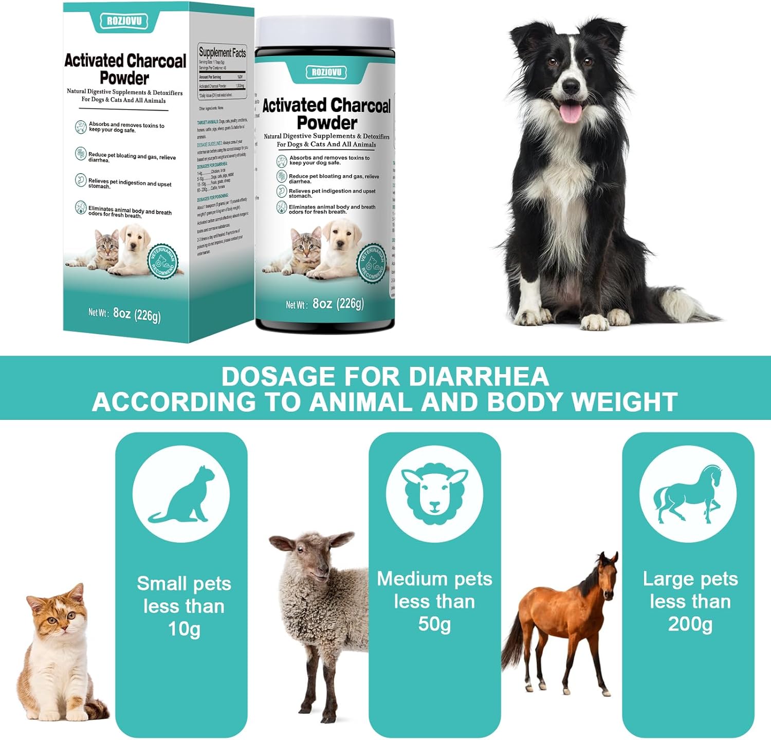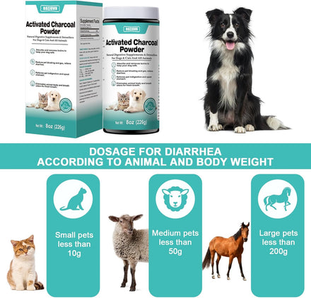 - Natural digestive support - Our activated charcoal powder is finely ground and odorless, making it much easier to absorb and digest compared to charcoal pills, capsules, or tablets. Acting like a super sponge, activated charcoal for dog effectively absorbs chemicals and toxins, aiding their elimination through the stool. Additionally, it can assist in reducing bloating and gas, relieving diarrhea and indigestion issues, and promoting the healthy functioning of the liver in animals.
