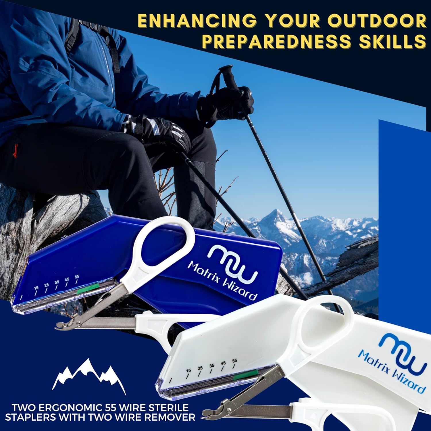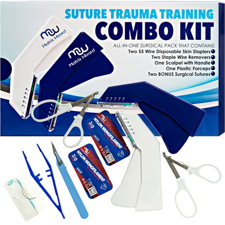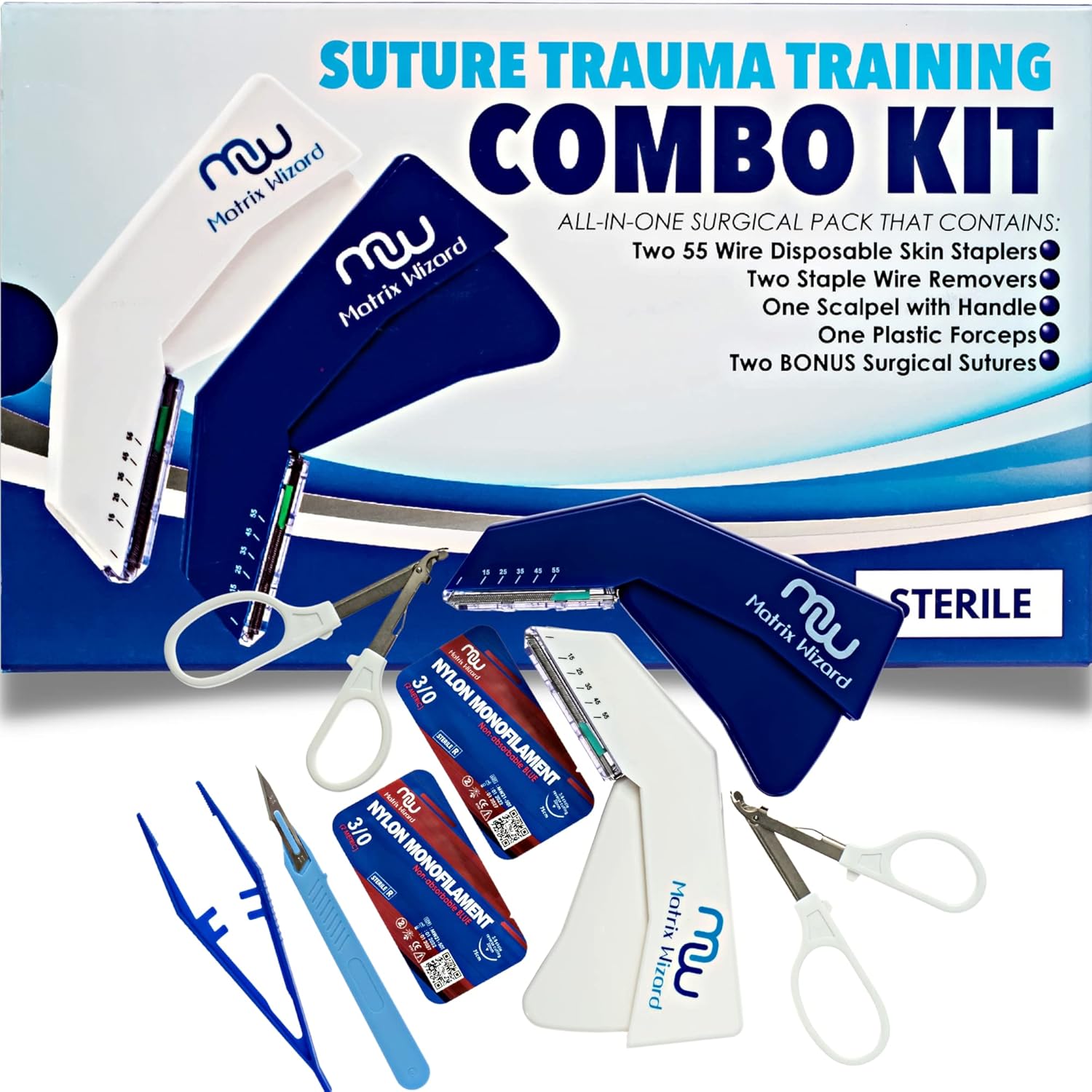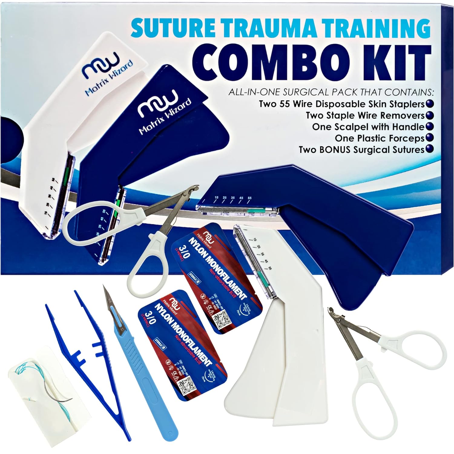- PREMIUM PRODUCT: The disposable Matrix Wizard wound closure stapling device, wire remover, plus suture tool combo pack is medical grade and high-quality. The package contains 55 wire Estapler, which are excellent compliments for surgical sutures, and other laceration closing instruments. It is a perfect addition to your existing emergency training set. It’s simple, flexible, safe, and efficient. The package is so handy it can fit in your practice backpack. NOT FOR CLINICAL USE.
