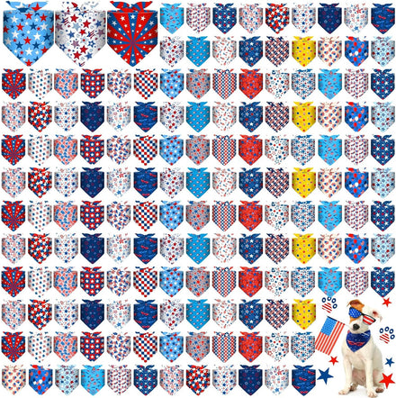 Features: Easy to clean and fold: These triangle dog neckerchief can be folded multiple times for easy storage and portability. It can be hand washed or machine washed, and it is also very convenient for daily replacement and cleaning. Multiple ways to wear: You can tie our adjustable 4th of july dog scarf around your pet's neck or head, or even on your pet's back. Specifications: Material: polyester Dimensions: approx. 23.2 x 16.4 x 16.4 inches (58 x 41 x 41 cm) Color: as shown in the pictures Package includes: 180 X 4th of july dog bandanas bulk Notes: Due to manual measurement, there may be slight errors in size. Due to different screen displays, there may be slight differences in color. Please measure your pet's size before ordering. And observe the pet's reaction when using. Please remove the product in time if there is any discomfort.