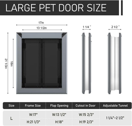 - 【Large DOG DOOR】 Doggie door for Dogs frame size is 17''(W) x 21 1/3''(H), Flap opening is 131/2 ”(W) x 18''(H). It fits paneled, wood, PVC, and metal doors 11/4 '' - 2 1/2'' thick, and is designed for pets up to 120 pounds.