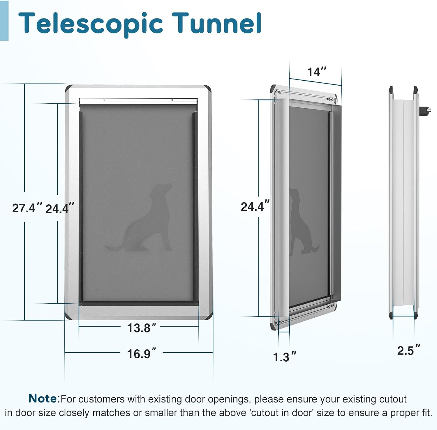 - DIMENSIONS: This xl dog door has adjustable tunnels to fit many types thickness doors. The pet doors for dogs thickness between 1.2" and 2.5". Flap Opening: 13.8"W x 24.4"H.The doggie doors for large dogs can cater to pets up to 220 lbs. Door Frame: 16.9"W x 27.4"H. Cutout in door:14"W x 24.4"H. Please measure if the size is suitable before purchasing