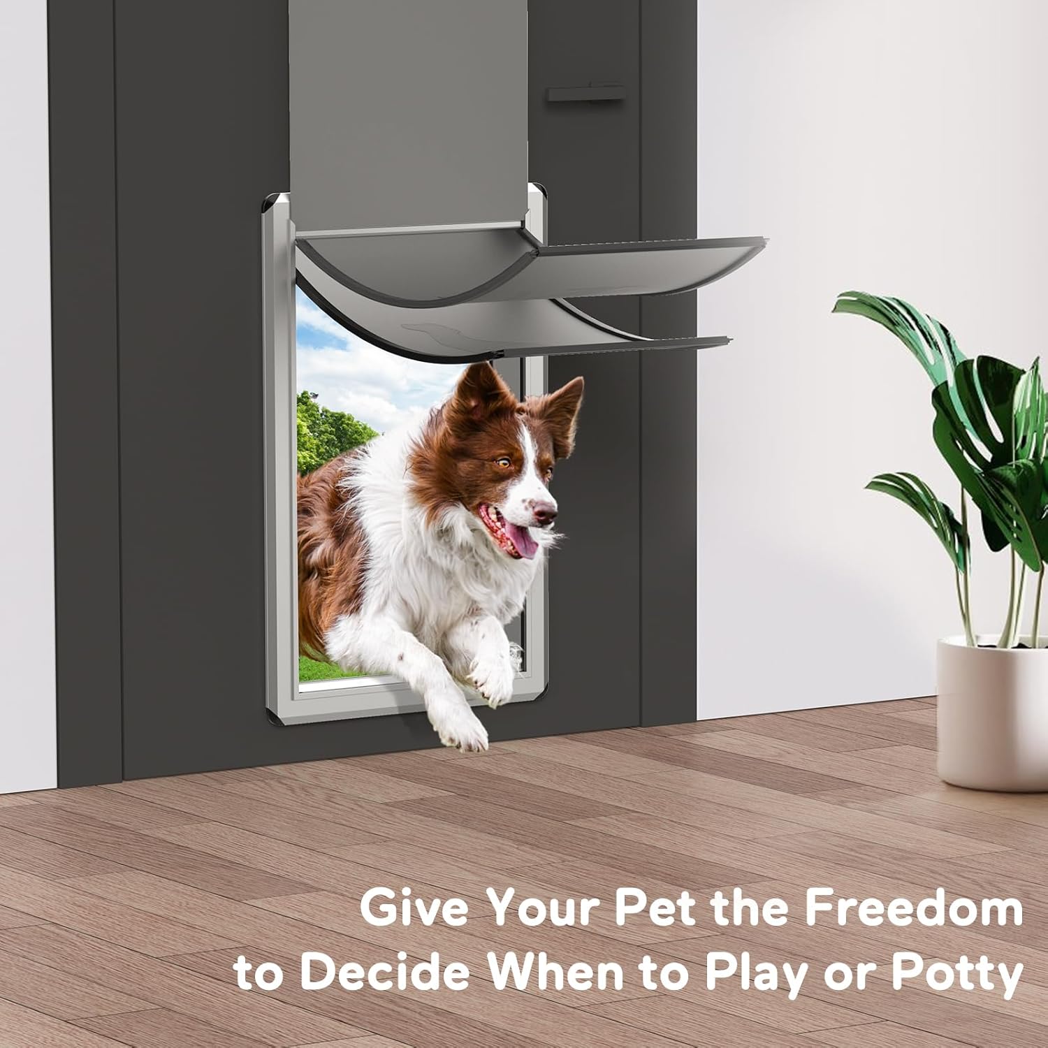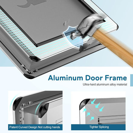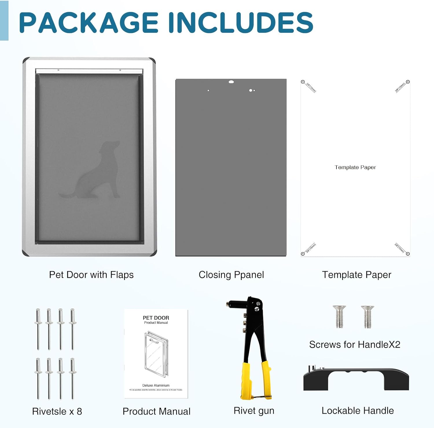 - Sturdy and Built to Last: This large dog door for exterior doors is made of high quality aluminum alloy material, rust resistant.The sliver color of the aluminum frame combines sturdy with an attractive appearance, fitting seamlessly into your door decor. Screws reinforcement make doggie doors sturdy enough to ensure your pet's frequent in and out for a long time
