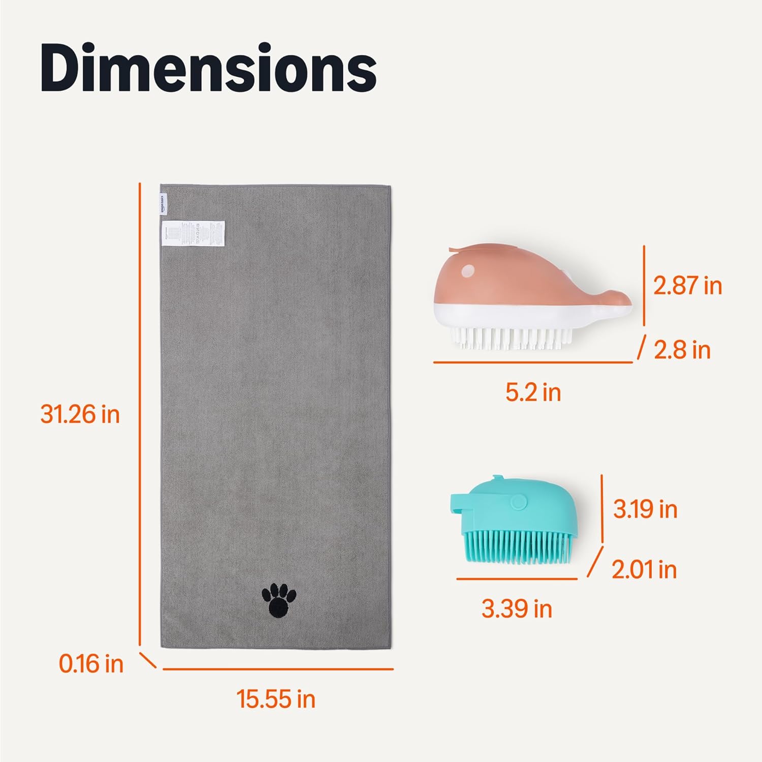 Amazon Basics Dog Bath Brush with Shampoo Dispenser and Fast Dry Towel, 3-Pack, Blue and Orange