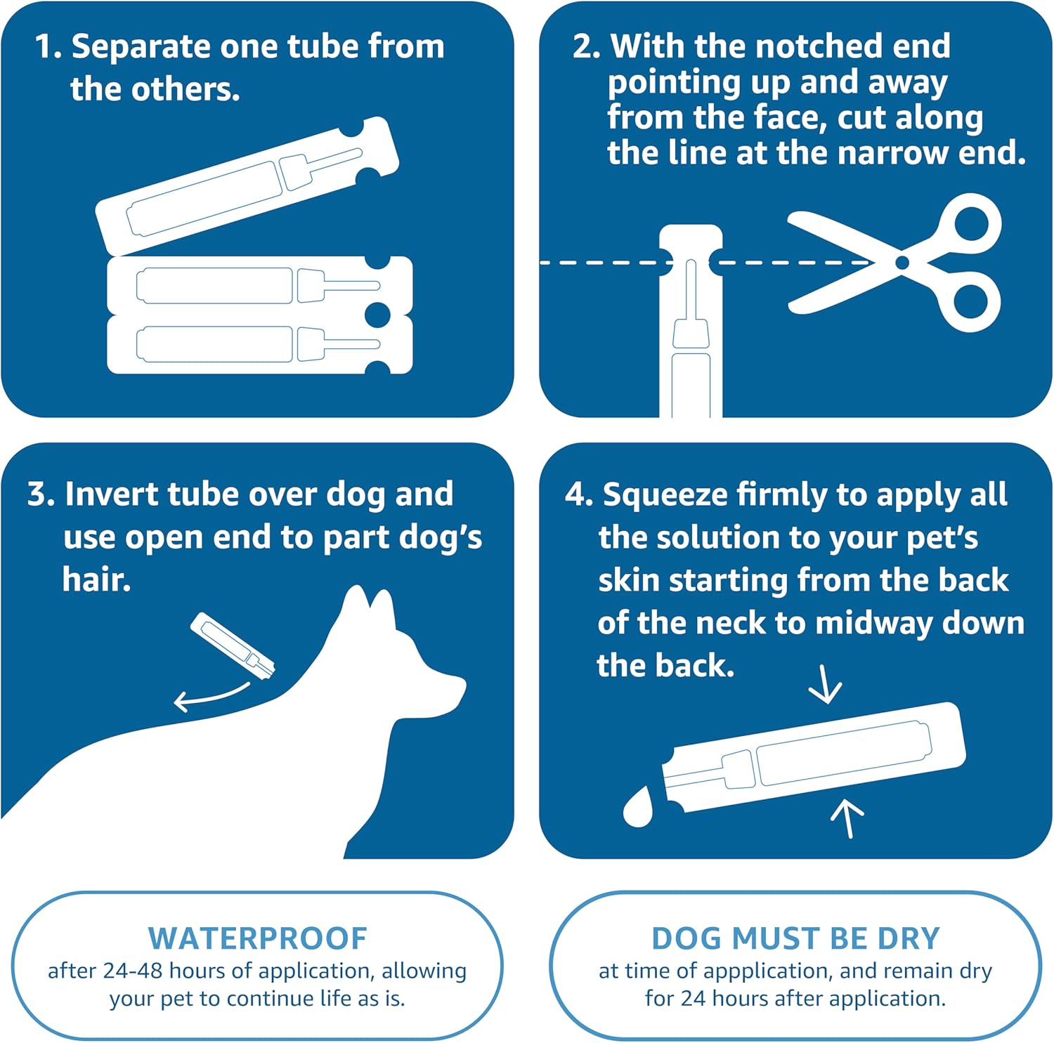 - Waterproof: 24 hours after application your pet’s treatment is protected against rain and water activities