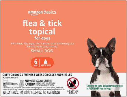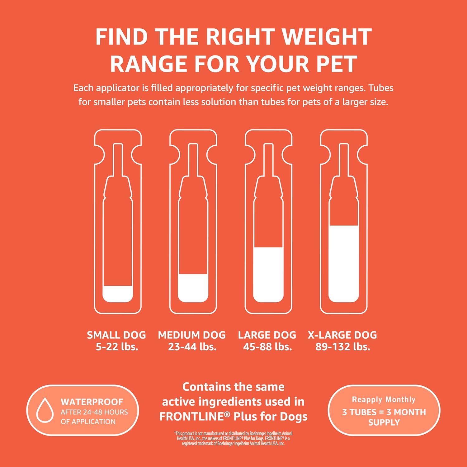 Amazon Basics flea and tick topical for Dogs kills fleas, flea eggs, flea larvae, ticks and chewing lice. The fast-acting, long-lasting treatment is formulated to protect your dog against dangerous pests. It breaks the flea life cycle by killing flea eggs and larvae and kills ticks, including deer ticks that may transmit Lyme disease. For best results, apply once a month to protect your dog from fleas and ticks.