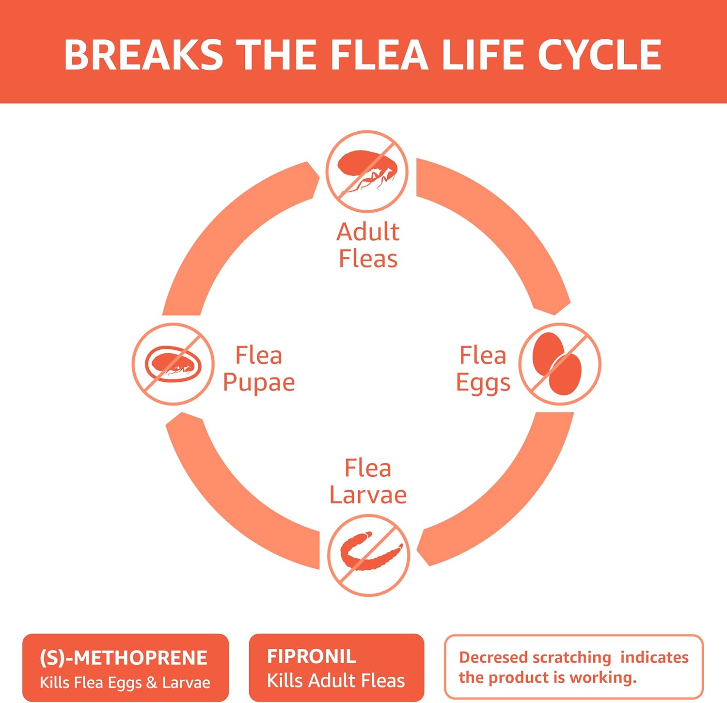 - Active ingredients Fipronil and (s)-methoprene prevent flea infestations by killing flea eggs, flea larvae, mosquitos, biting flies and chewing lice