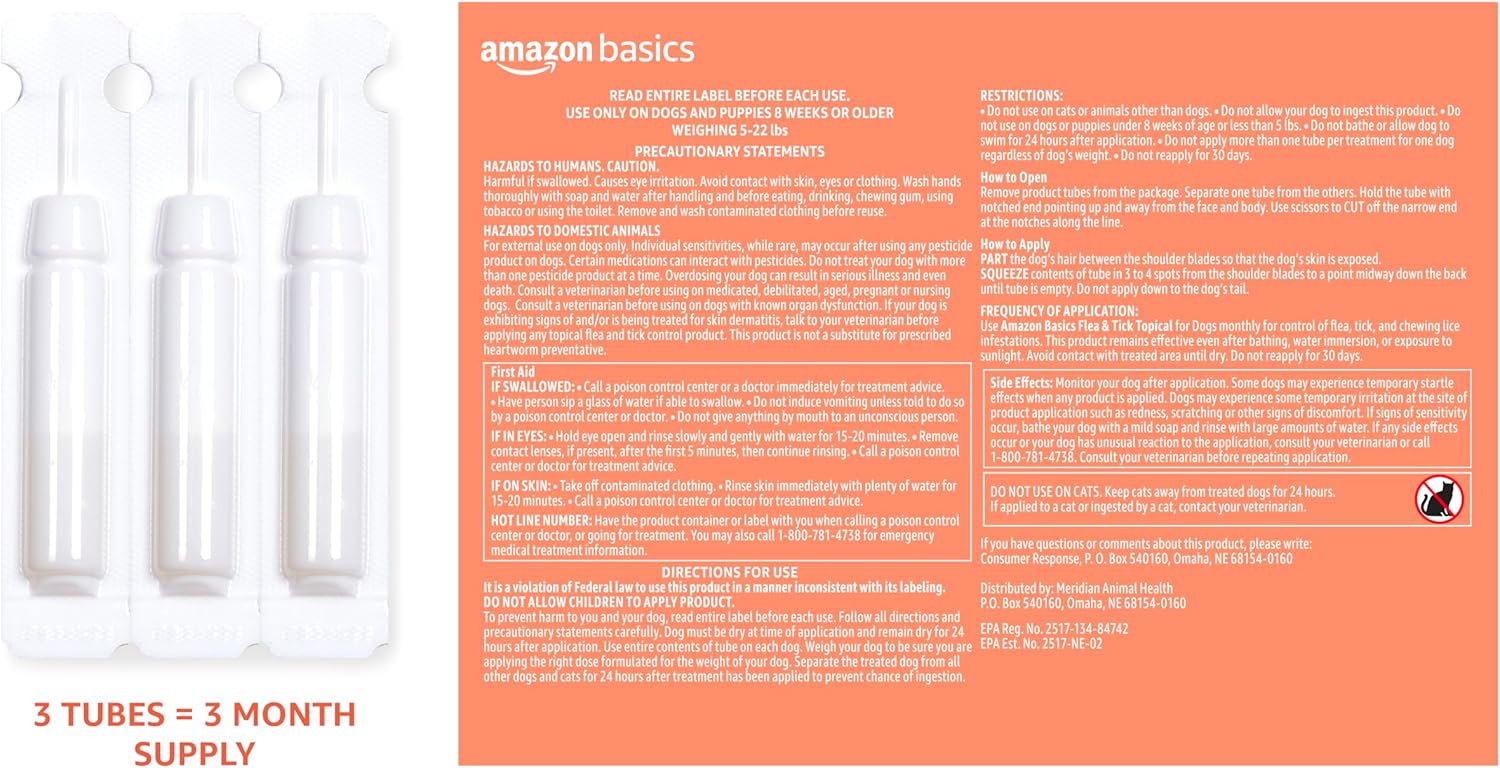 - One 3 dose pack of Amazon Basics Flea and Tick Treatment for Dogs, Small (5-22 lbs), 3 Count (Previously Solimo)