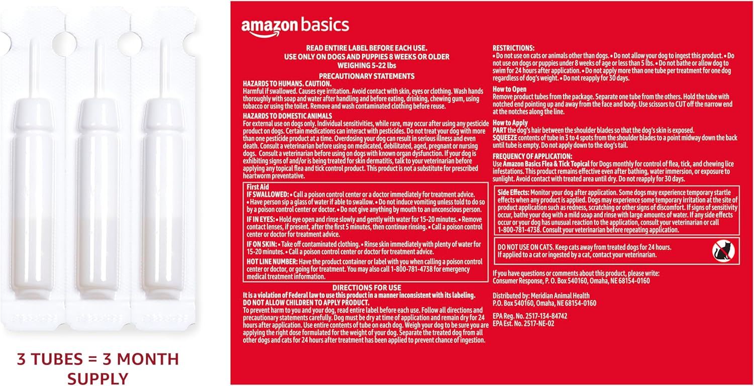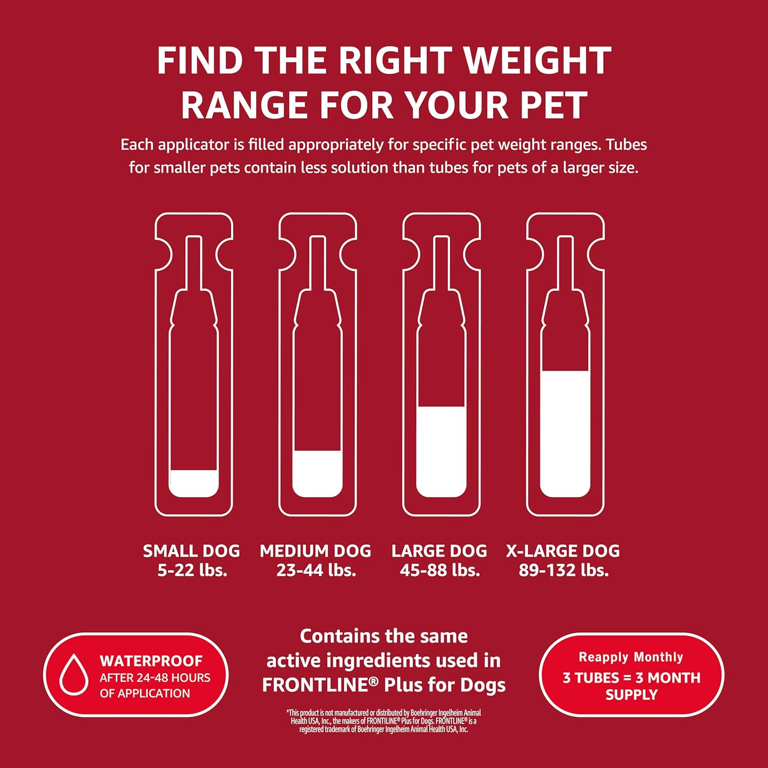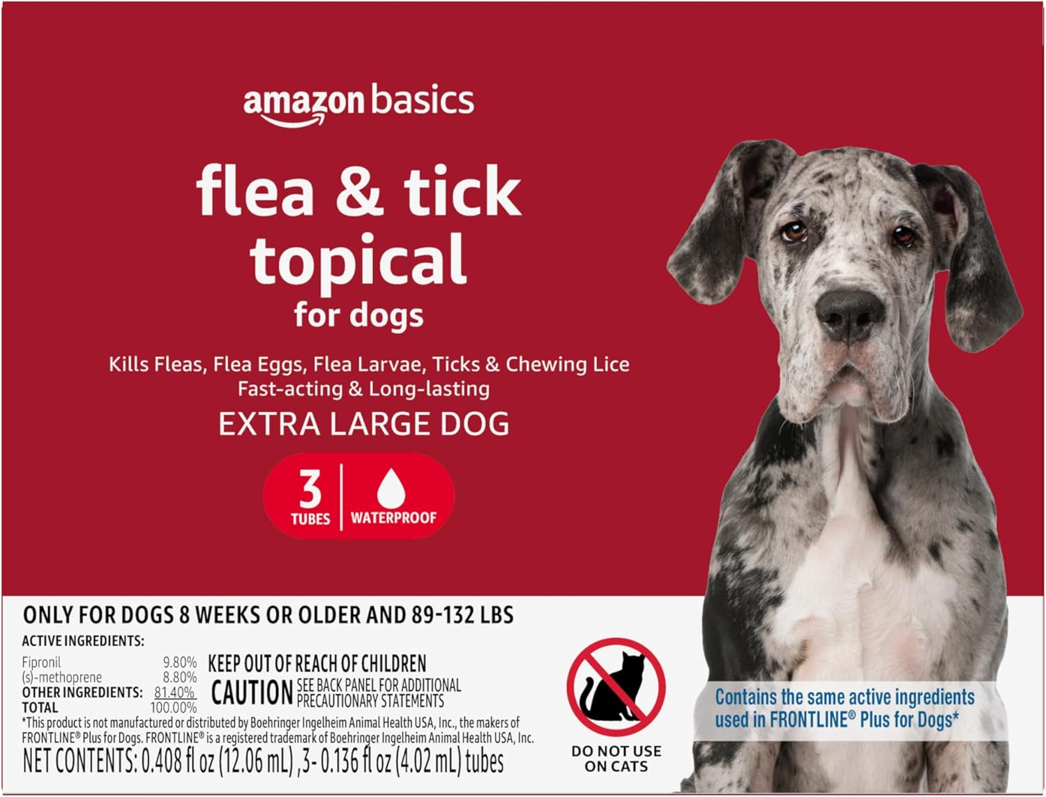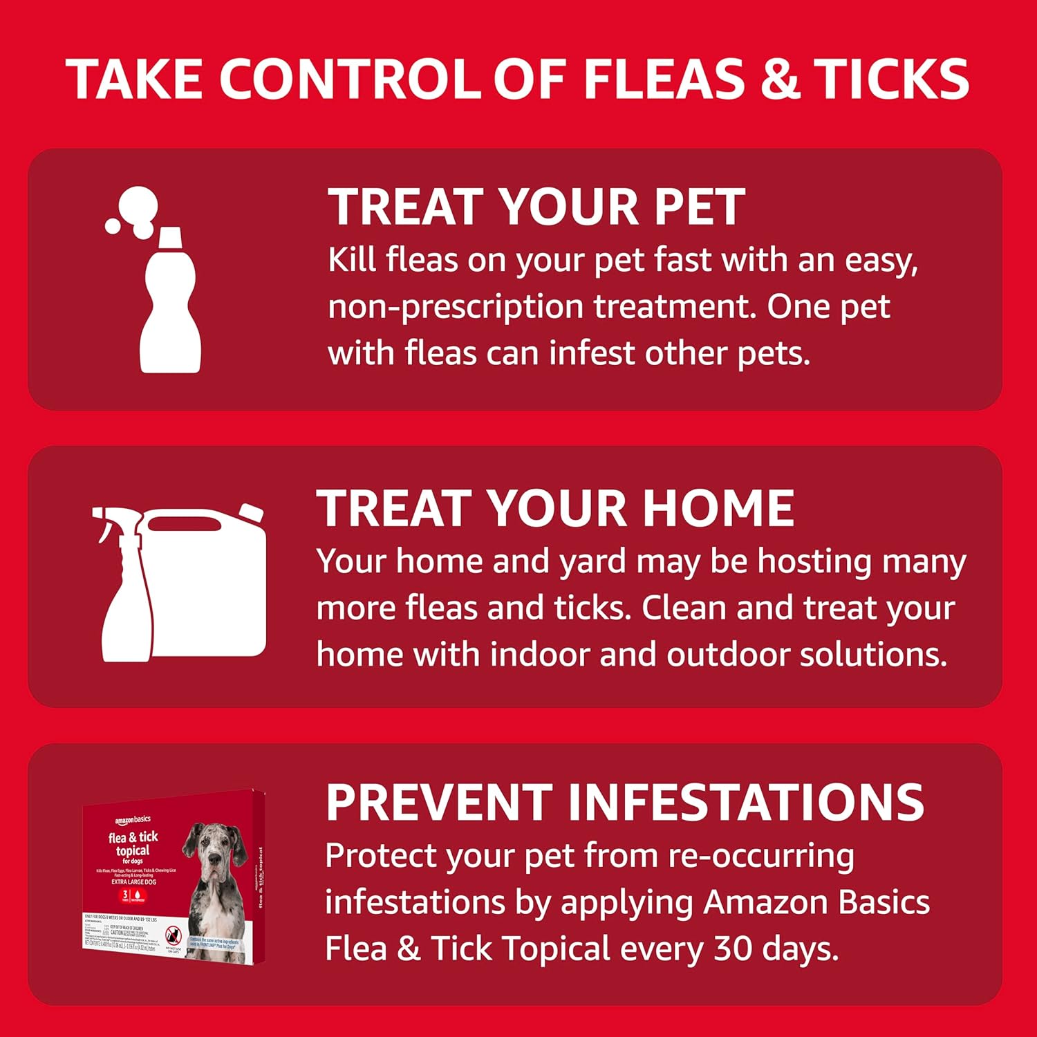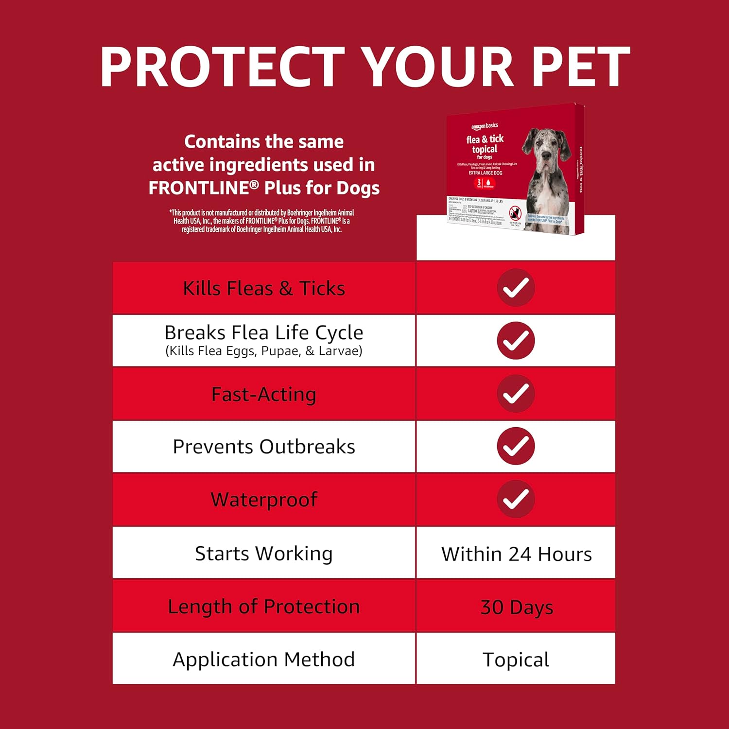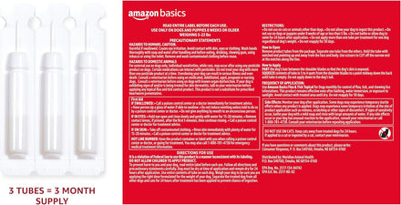 Amazon Basics flea and tick topical for Dogs kills fleas, flea eggs, flea larvae, ticks and chewing lice. The fast-acting, long-lasting treatment is formulated to protect your dog against dangerous pests. It breaks the flea life cycle by killing flea eggs and larvae and kills ticks, including deer ticks that may transmit Lyme disease. For best results, apply once a month to protect your dog from fleas and ticks.